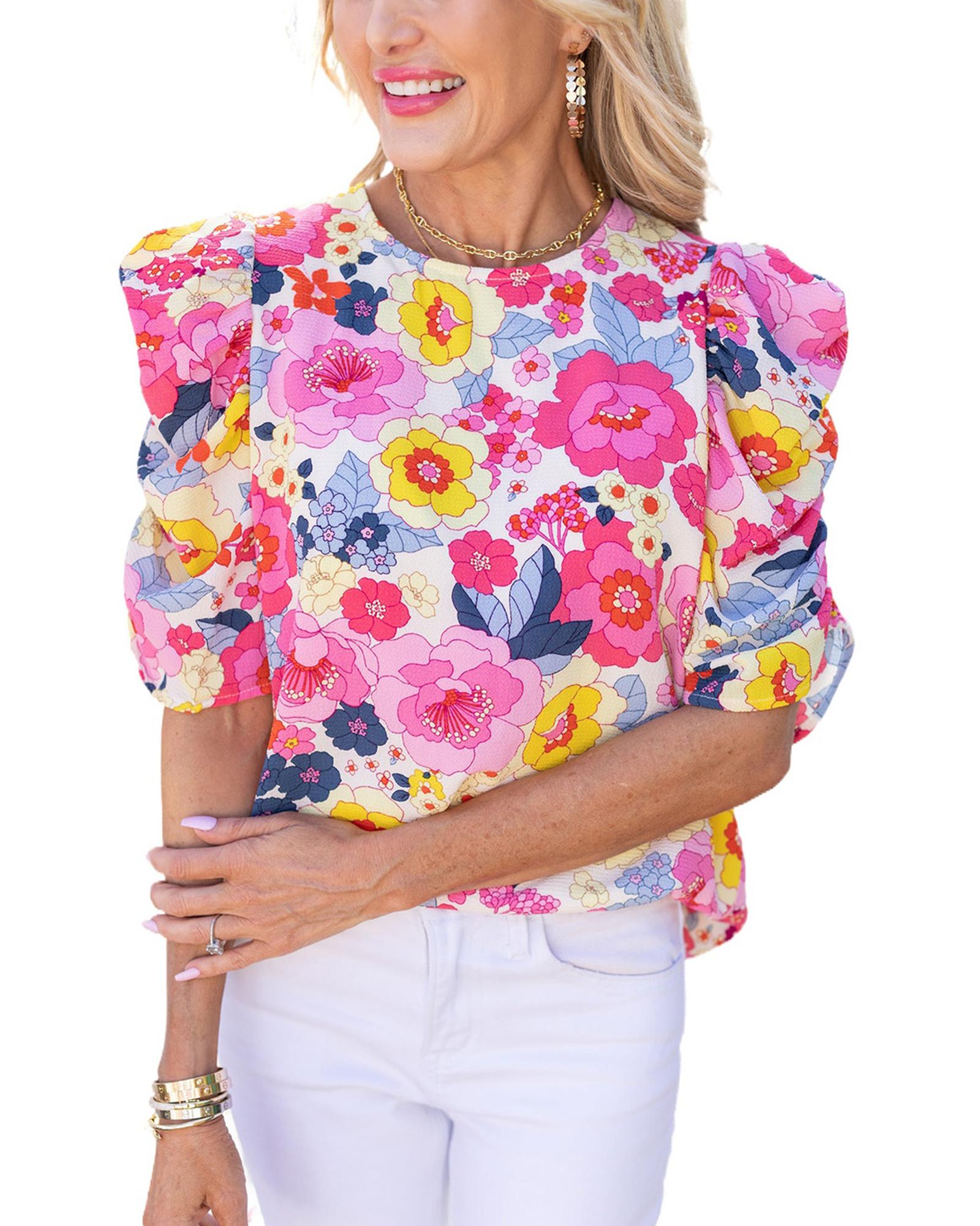 - One floral ruched puff sleeve blouse