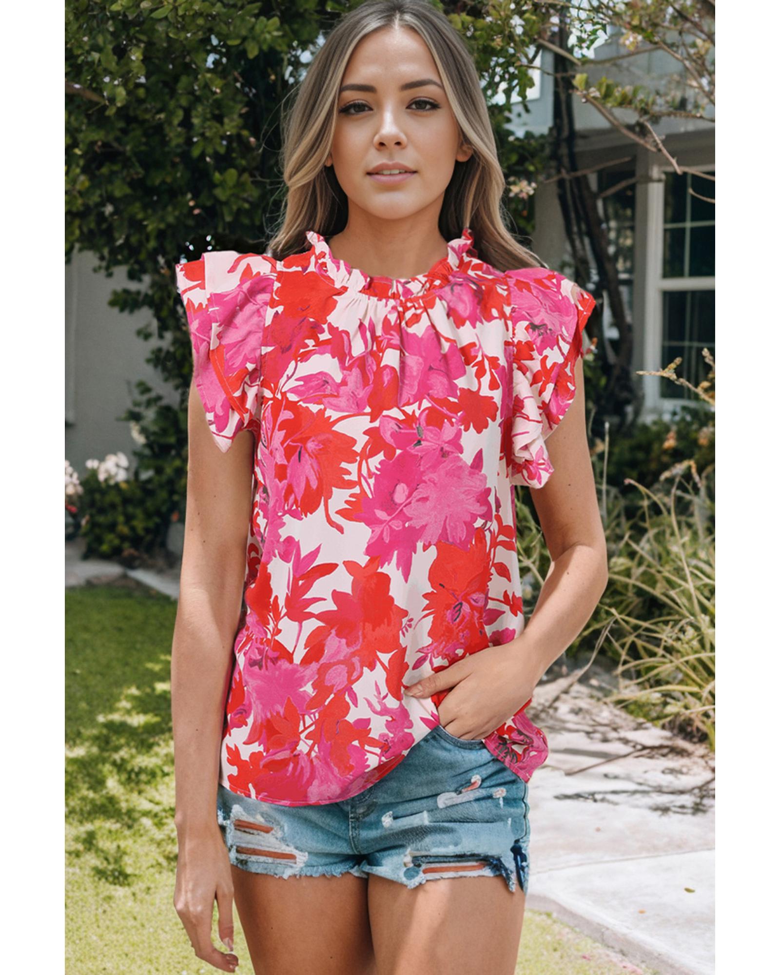 This blouse features a stylish floral design with flutter sleeves and a frilled neckline, making it suitable for both casual and formal occasions. Crafted from quality materials, it offers an elegant and sophisticated look for women who appreciate fashion.