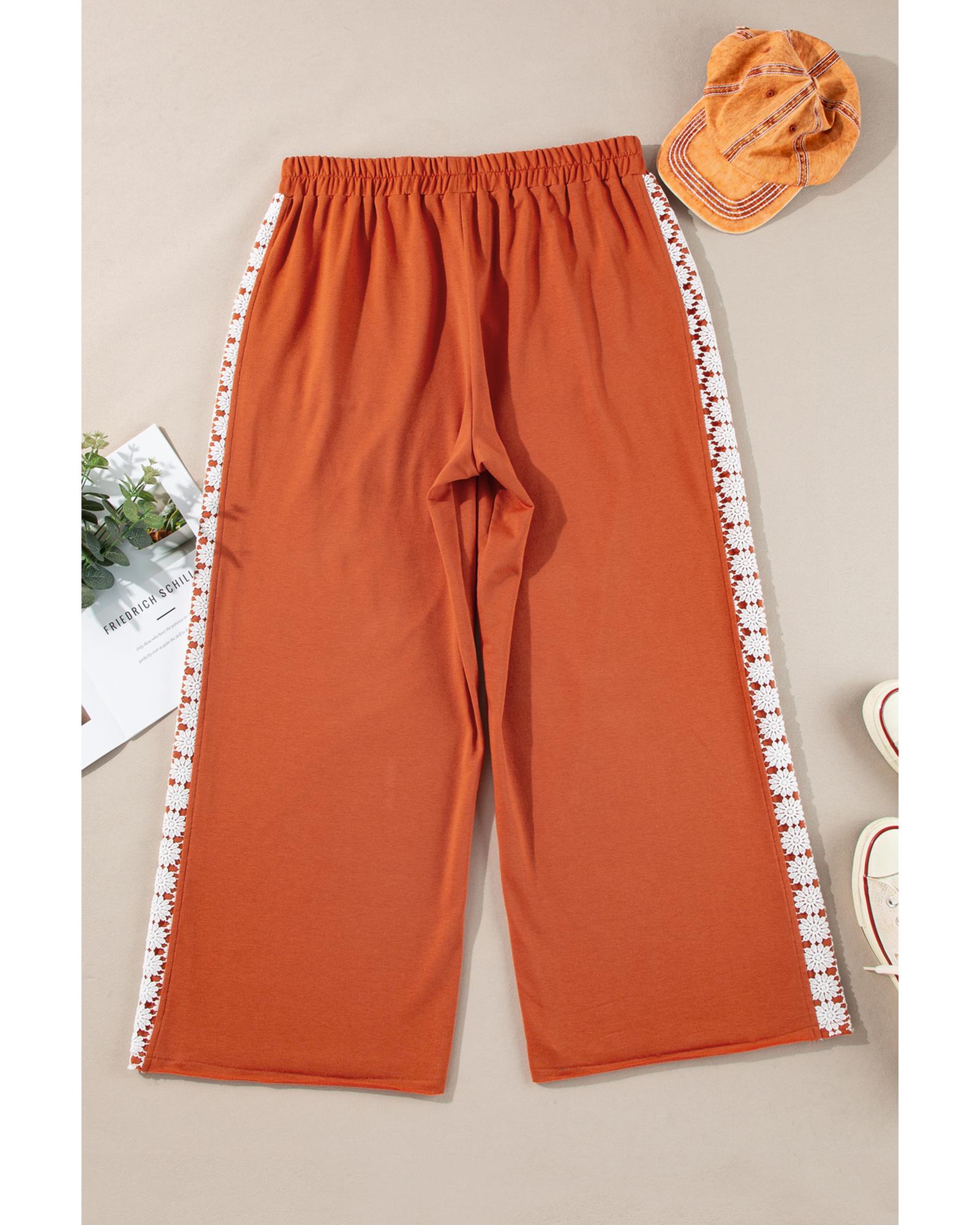 These plus size wide leg pants feature a bohemian-inspired design with floral crochet patches, offering a flowy and flattering silhouette. The comfortable drawstring waist ensures a customizable fit, making them suitable for various occasions.