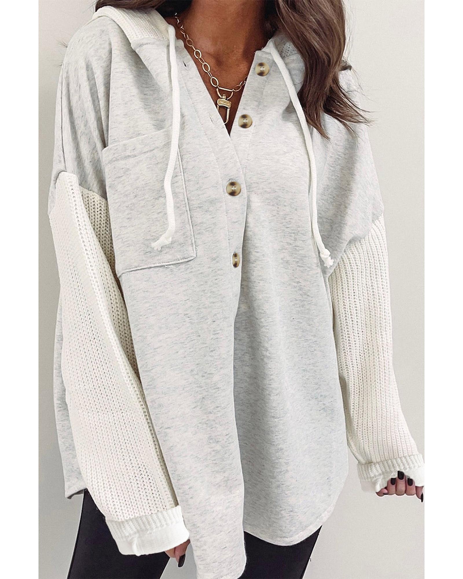 Azura Exchange Gray Button Up Contrast Knitted Sleeves Hooded Jacket – L