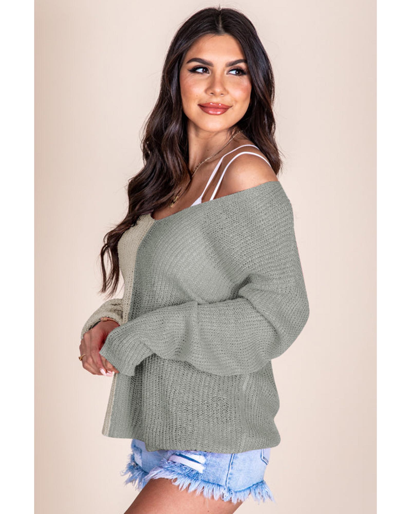 This long sleeve V-neck sweater features a stylish colorblock design in trendy hues, making it a versatile addition to your wardrobe. Crafted from soft and cozy knit fabric, it offers all-day comfort and a flattering fit. The V-neckline accentuates your collarbone, adding a touch of elegance. Suitable for various occasions, it pairs easily with jeans or skirts for a chic look.