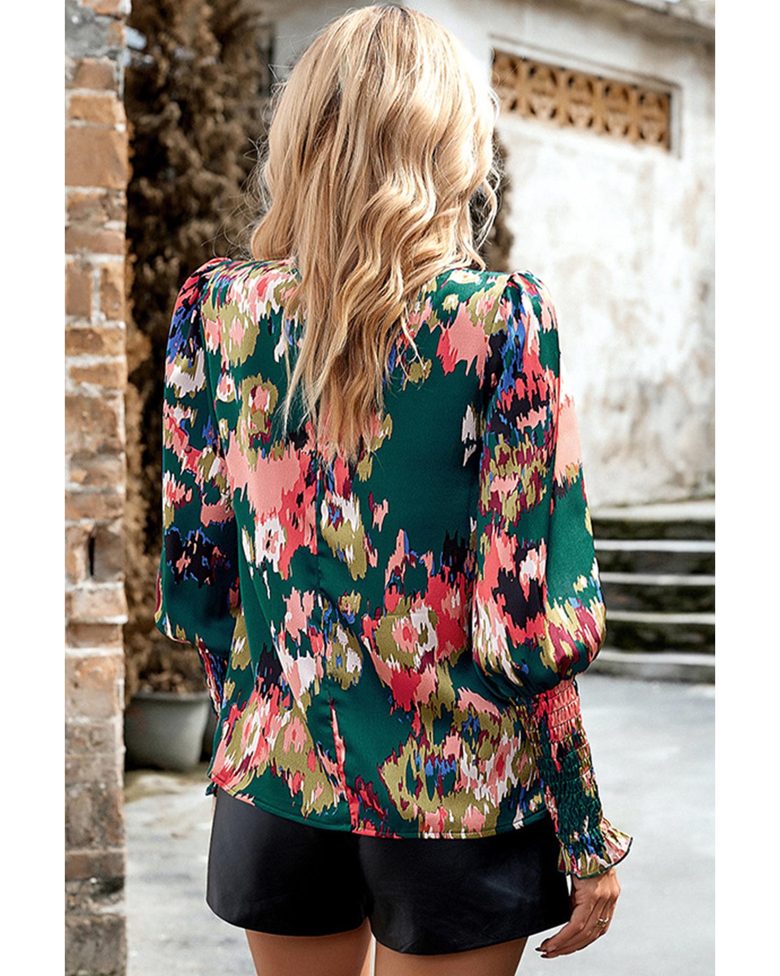 Azura Exchange Green Abstract Print Smocked Cuffs Frilled Neck Blouse – S