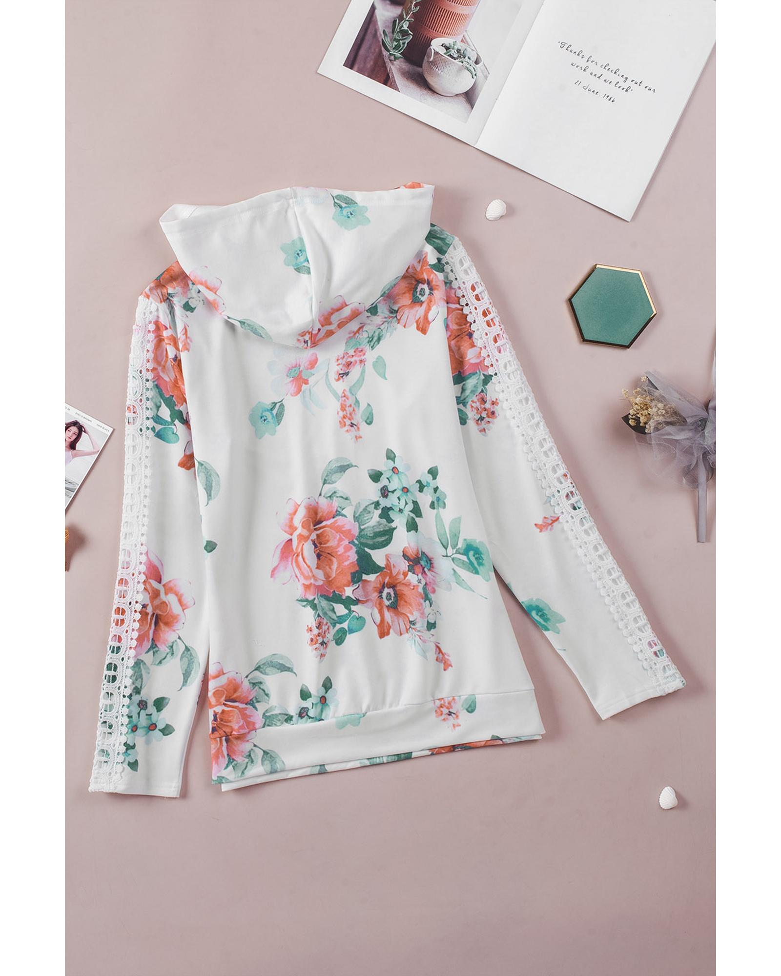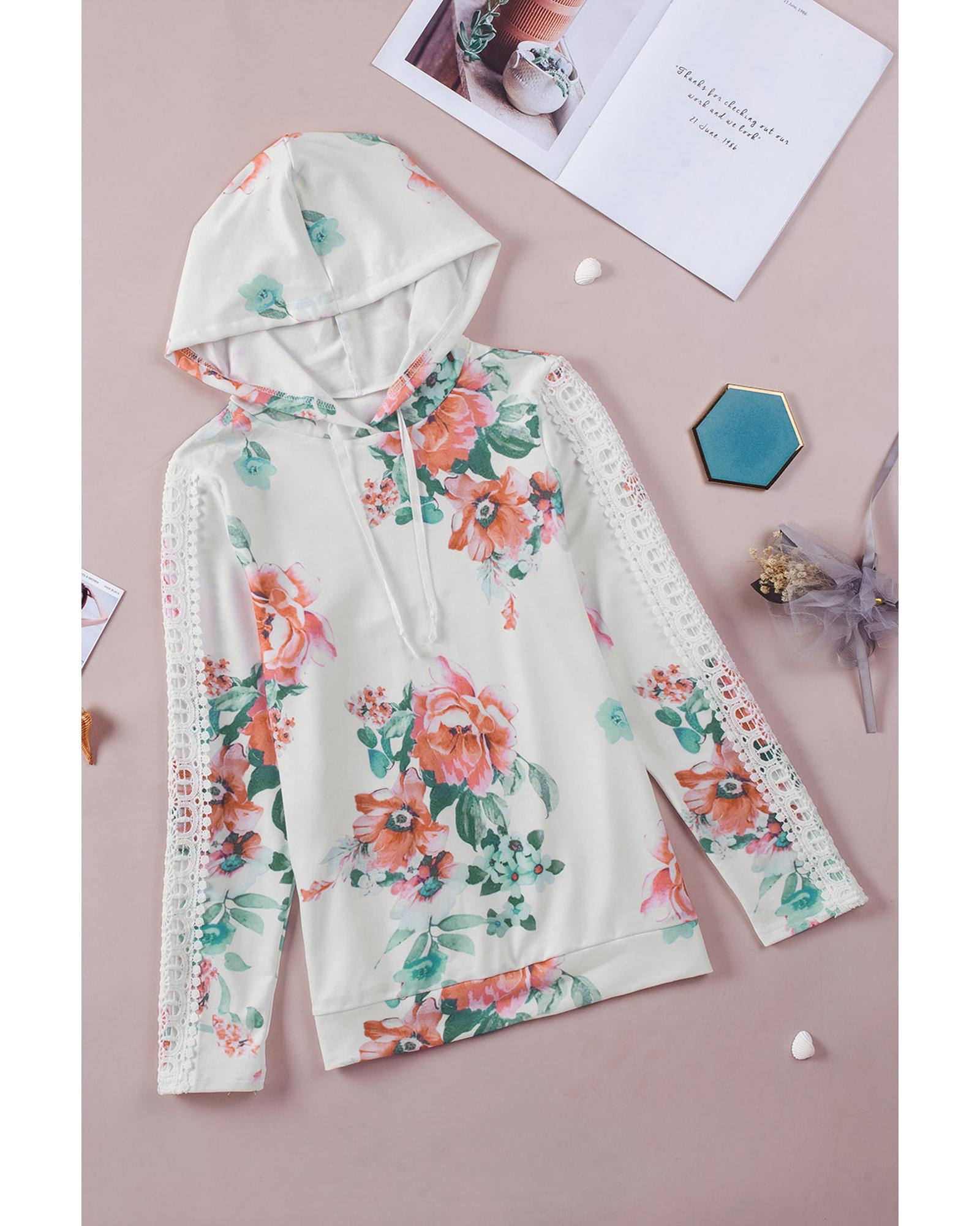 This long sleeve hoodie features a stylish floral print design with contrasting lace details on the sleeves. It combines feminine elegance with comfort, making it suitable for casual outings or relaxing at home. Crafted from high-quality materials, it offers durability and a comfortable fit. Available in various sizes, it is an essential addition to any woman’s wardrobe.