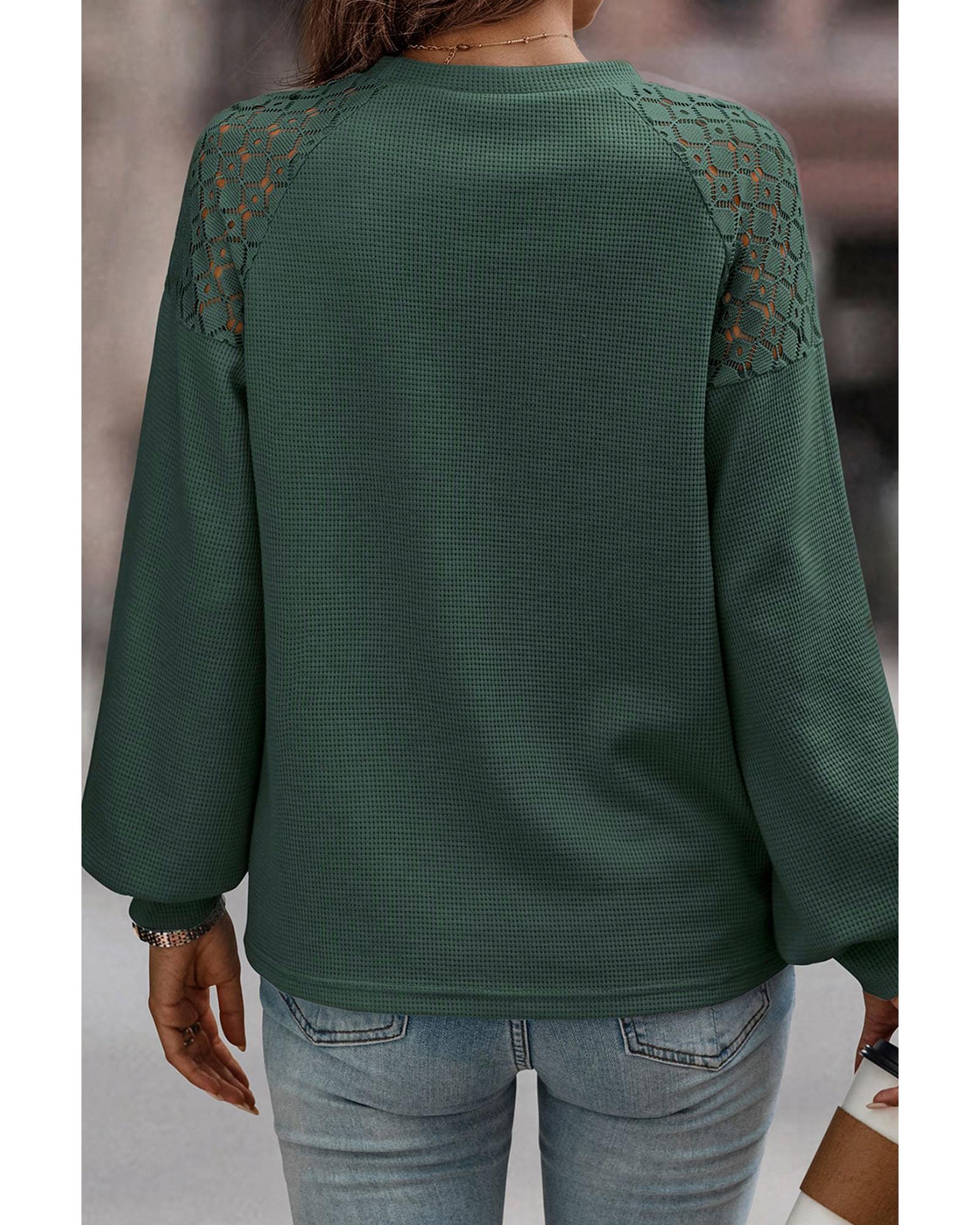This long sleeve pullover features a feminine waffle texture combined with delicate lace details, creating a stylish and unique look. Designed for casual wear, it offers a comfortable fit with a round neckline and puff sleeves that add a touch of elegance. Made from high-quality materials with good stretch, it ensures both comfort and durability.