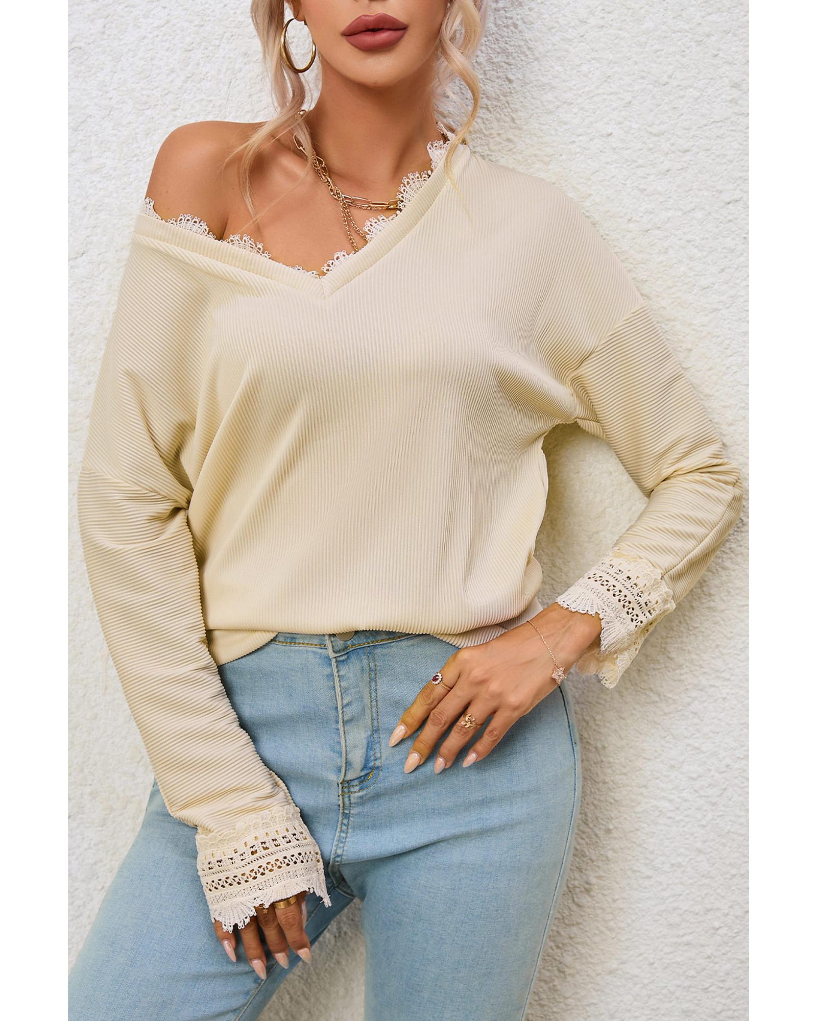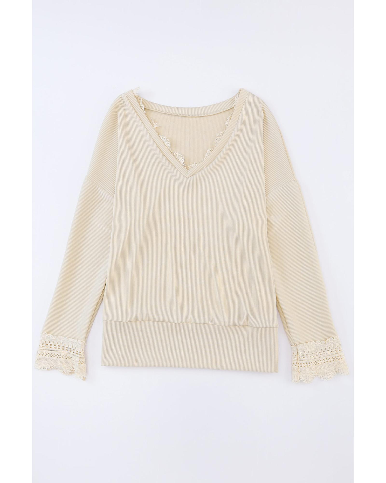 This long sleeve top features a ribbed texture with delicate lace trim detailing, offering a versatile and stylish option for various occasions. Designed with a V-neckline and a comfortable fit, it is suitable for different body types and can be dressed up or down as needed.