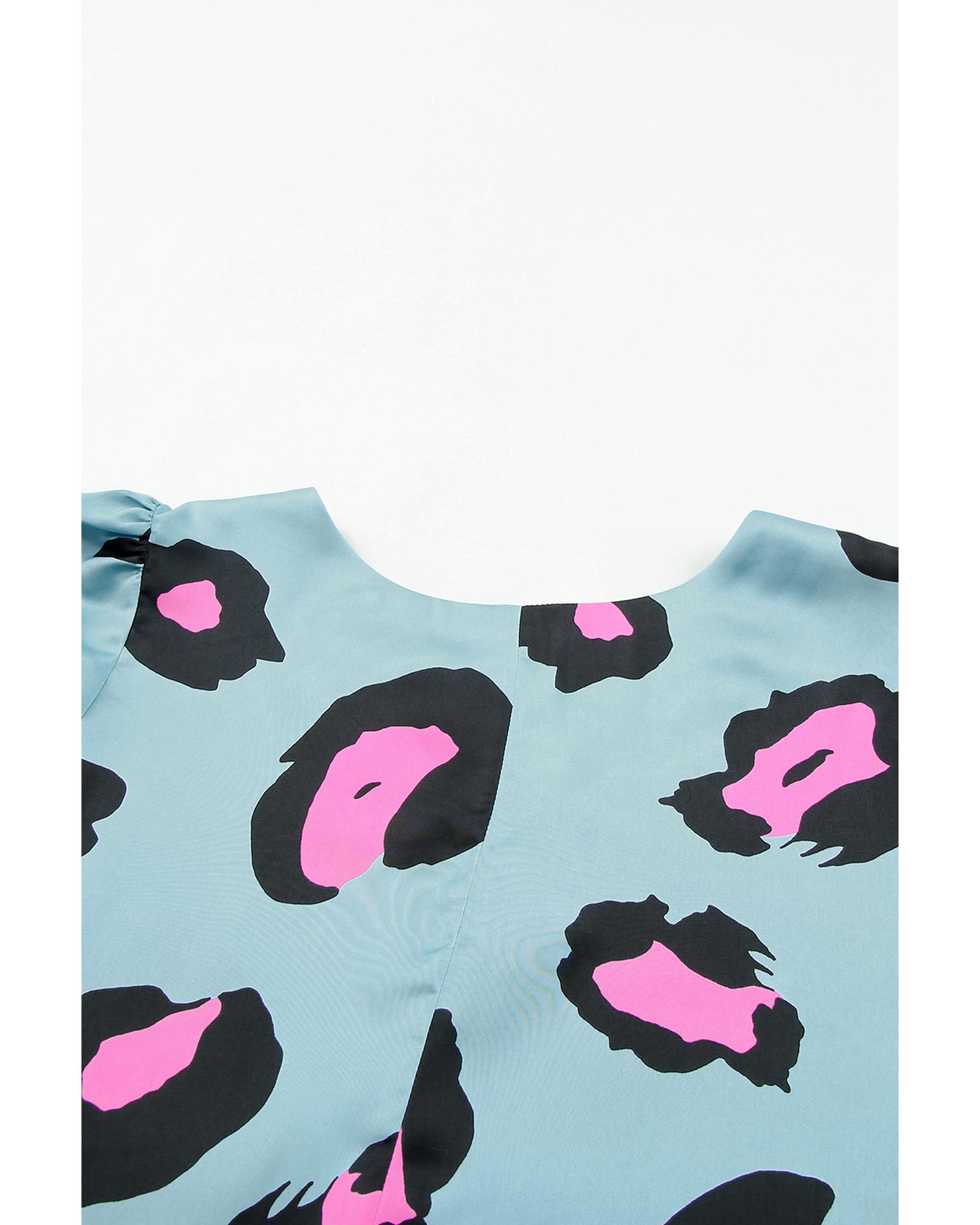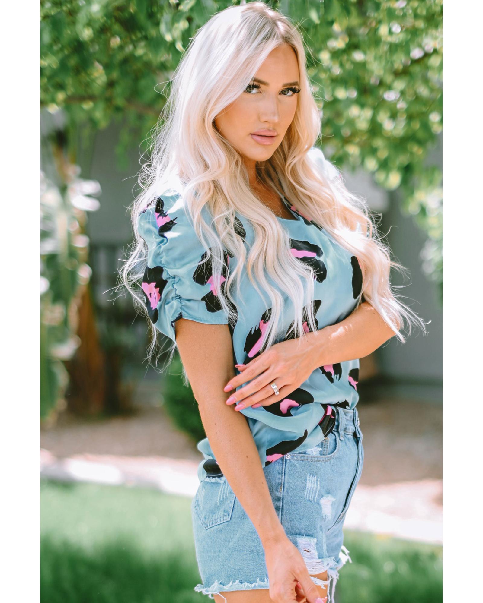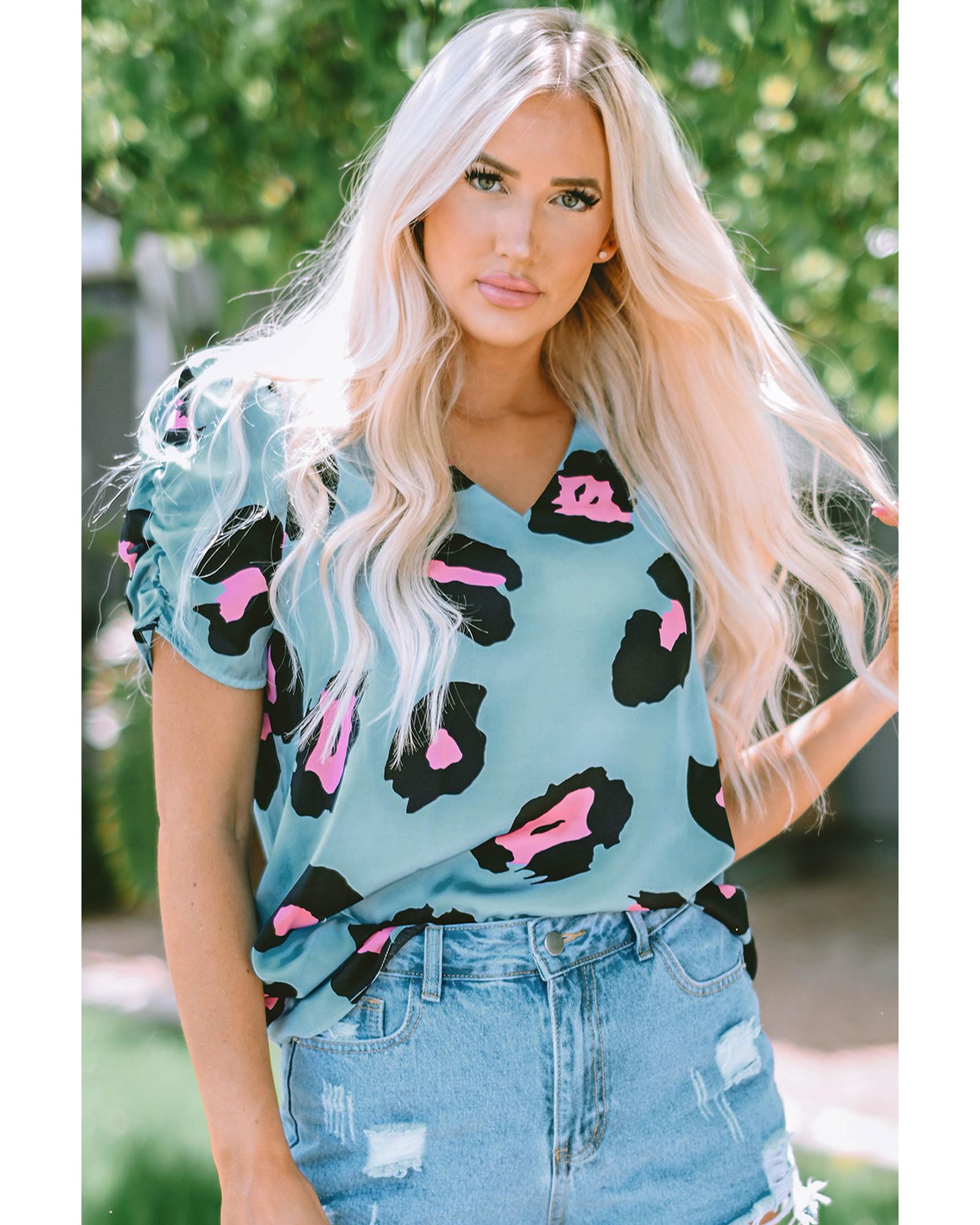 This leopard print ruched short sleeve blouse combines trendy design with comfort, making it a versatile addition to any wardrobe. Its bold pattern and unique detailing help you make a statement and showcase your individual style.
