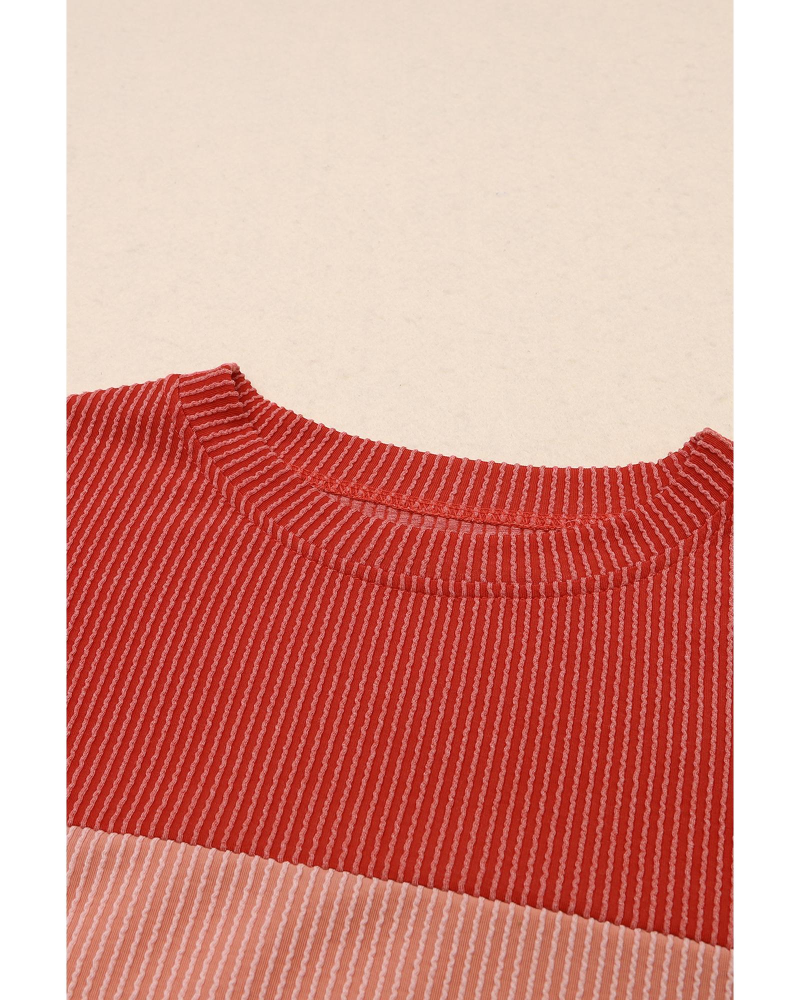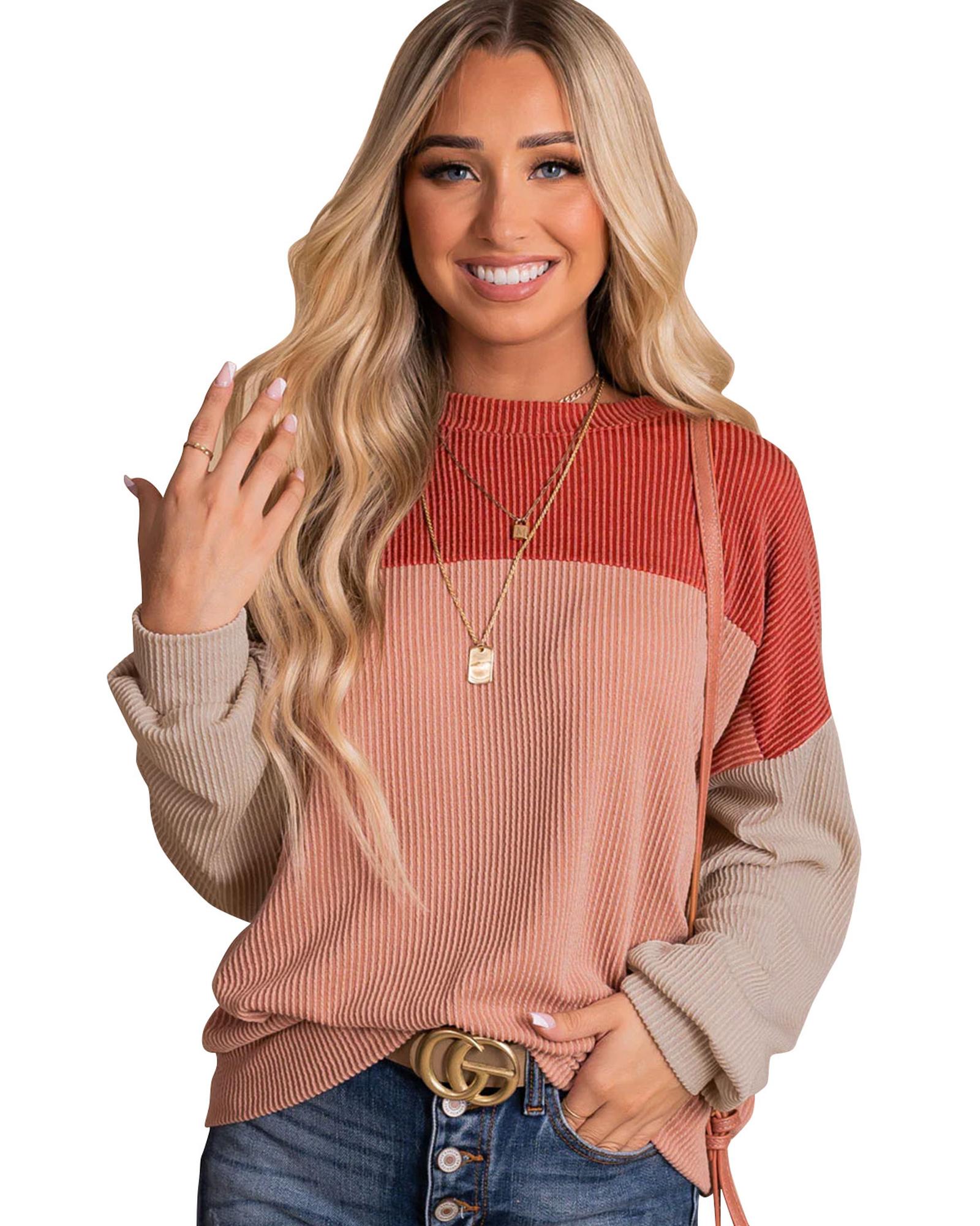 This long sleeve ribbed loose top features a stylish color block design, offering a versatile option suitable for various occasions. Crafted from quality materials, it provides comfort and durability with a fashionable appearance. The ribbed texture adds visual interest, while the long sleeves offer coverage and warmth, making it ideal for both casual and formal wear.
