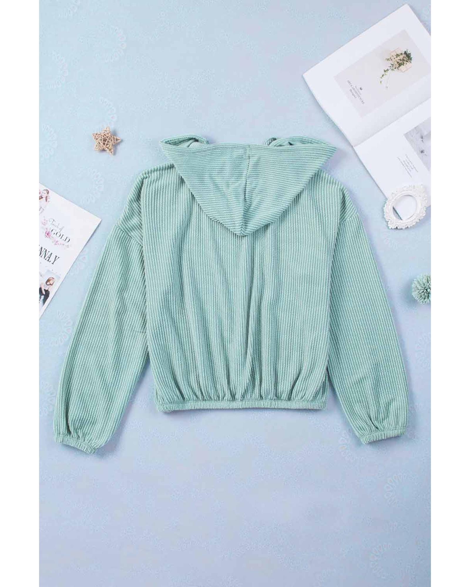 This loose fit ribbed V-neck hoodie is designed for women, combining comfort and style. Crafted with ribbed fabric, it offers added texture and a relaxed fit that allows for easy movement. The V neckline adds a feminine touch, while the hood provides extra warmth and a casual look. Its versatile design makes it suitable for various casual occasions.