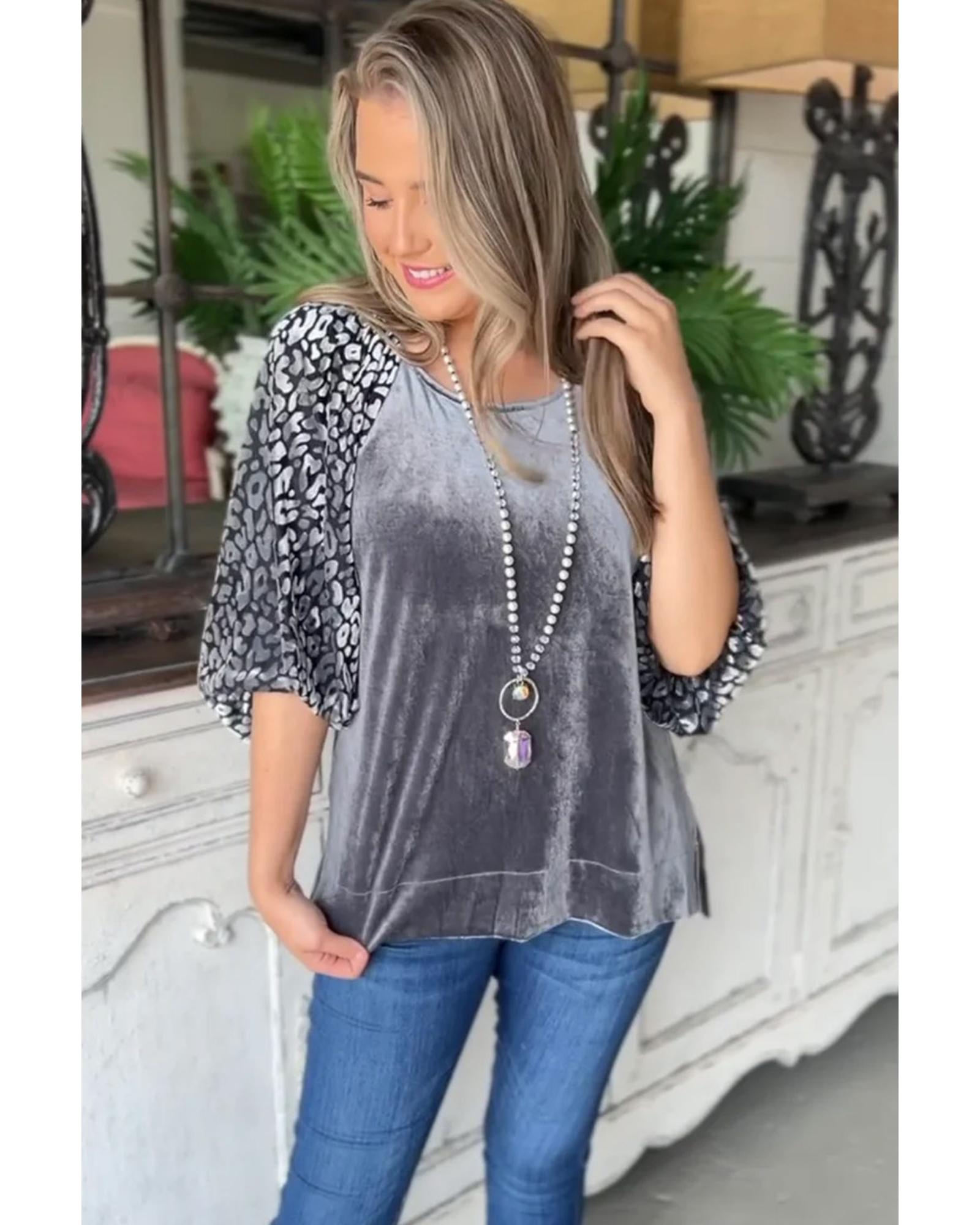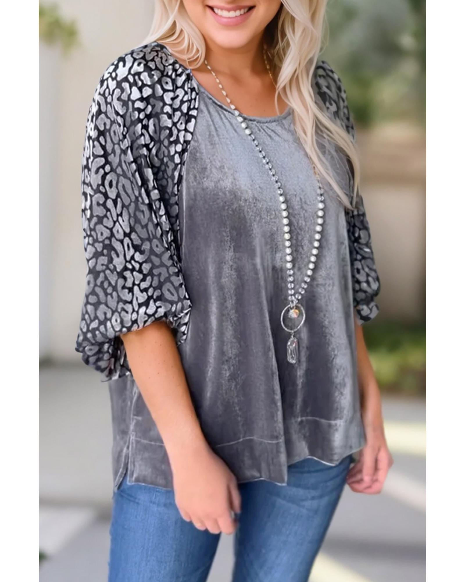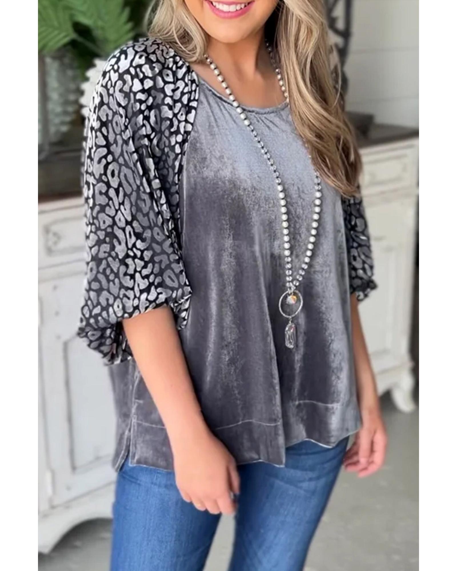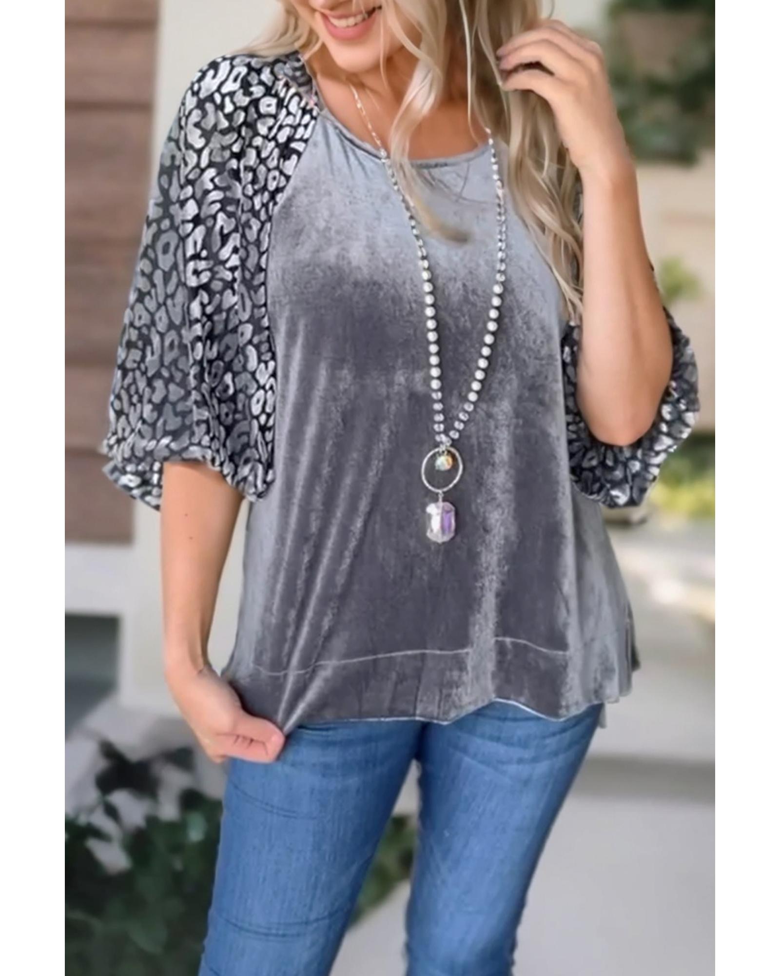 This medium grey velvet blouse features a stylish leopard splicing design with lantern sleeves, creating a unique and elegant look. The combination of velvet and leopard print adds a fashionable touch suitable for various occasions. The blouse offers a versatile style with endless pairing options, making it a chic addition to any wardrobe.