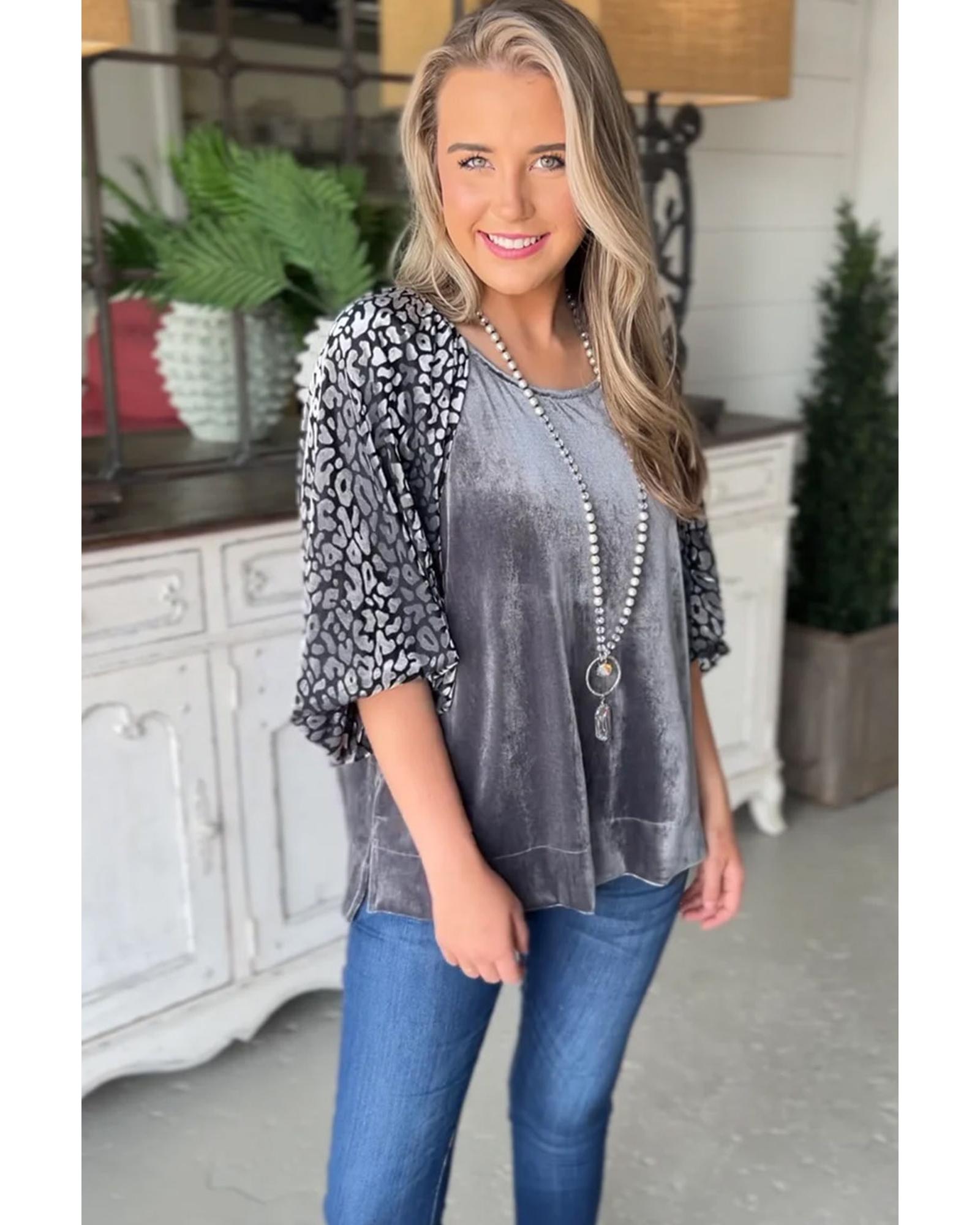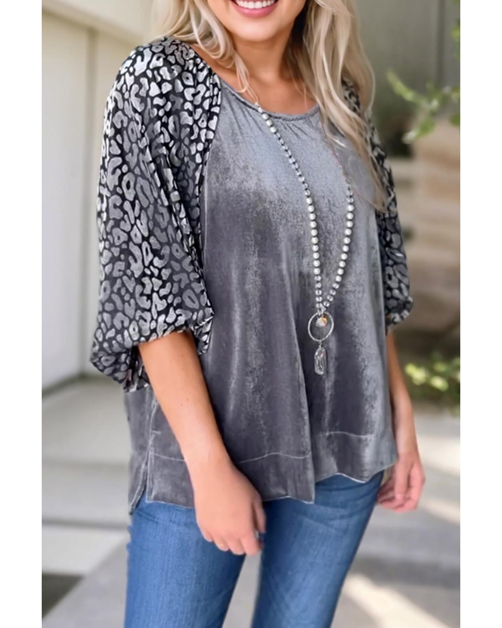 This medium grey velvet blouse features a stylish leopard splicing design with lantern sleeves, offering a unique and elegant look. The combination of velvet and leopard print creates a fashionable statement suitable for various occasions. The blouse is crafted from a soft, high-quality fabric that provides comfort and sophistication.