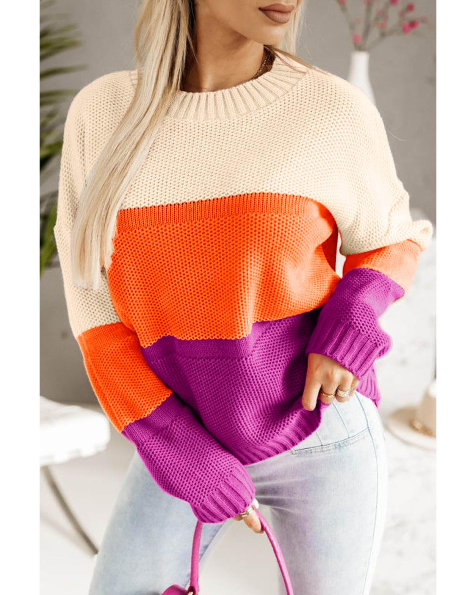 This multicolor color block knit sweater features a relaxed drop shoulder design and a classic round neck, making it a versatile addition to your casual wardrobe. Crafted from soft and cozy material, it offers both warmth and comfort for everyday wear.