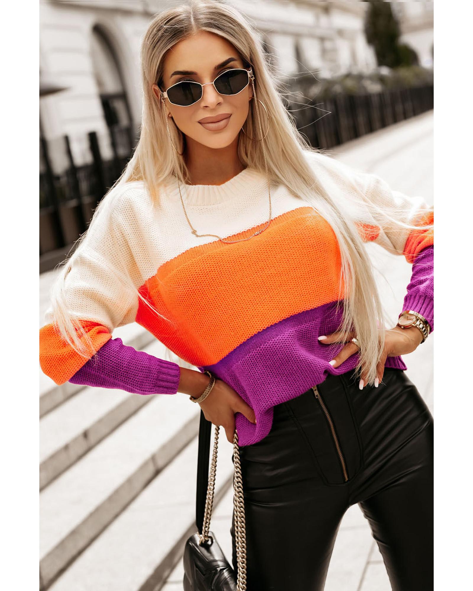 This multicolor color block knit sweater features a relaxed drop shoulder design and a classic round neck, making it a versatile addition to your casual wardrobe. Crafted from soft and cozy material, it offers both warmth and comfort for everyday wear.