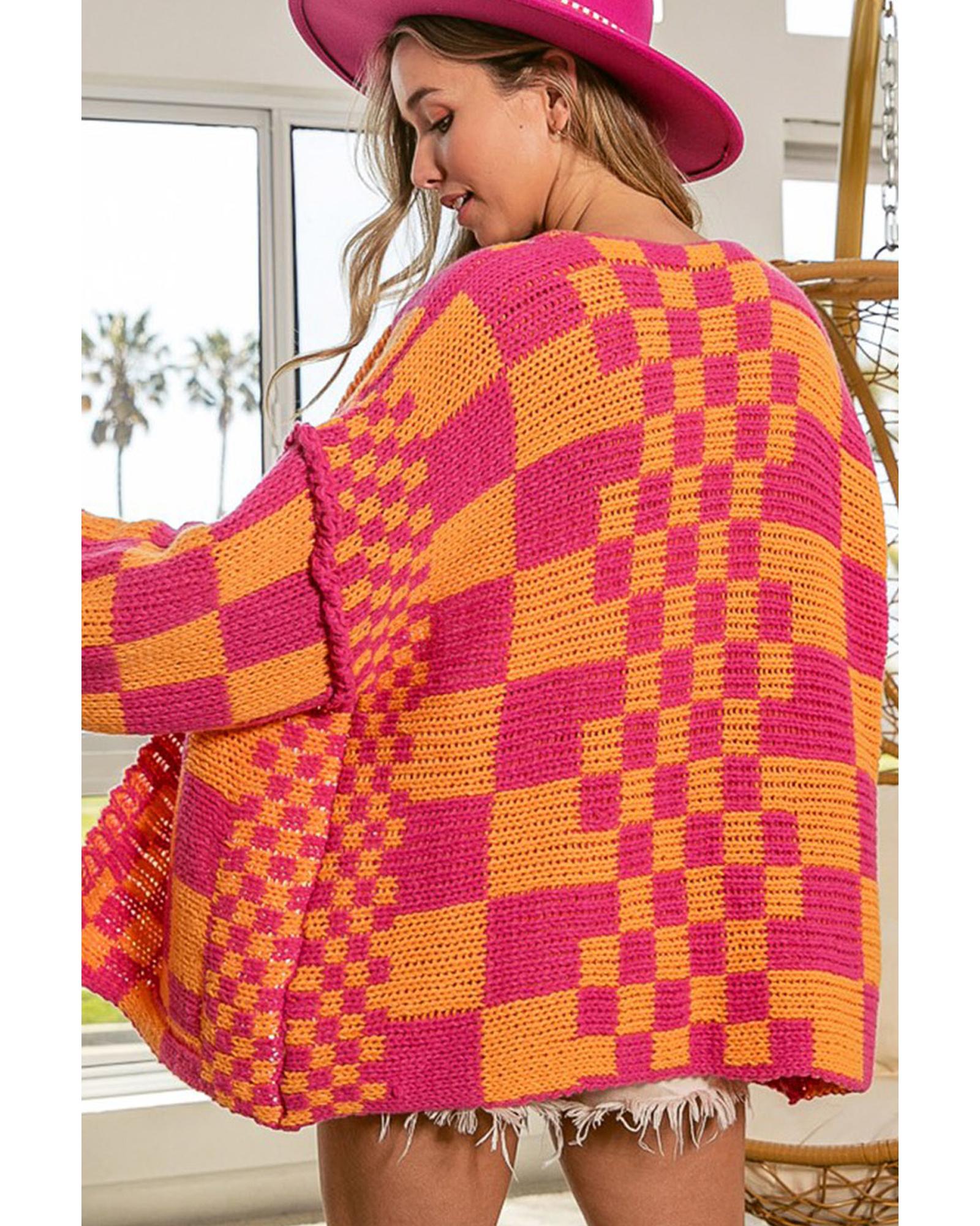 - Multicolor open front cardigan with a checkered pattern