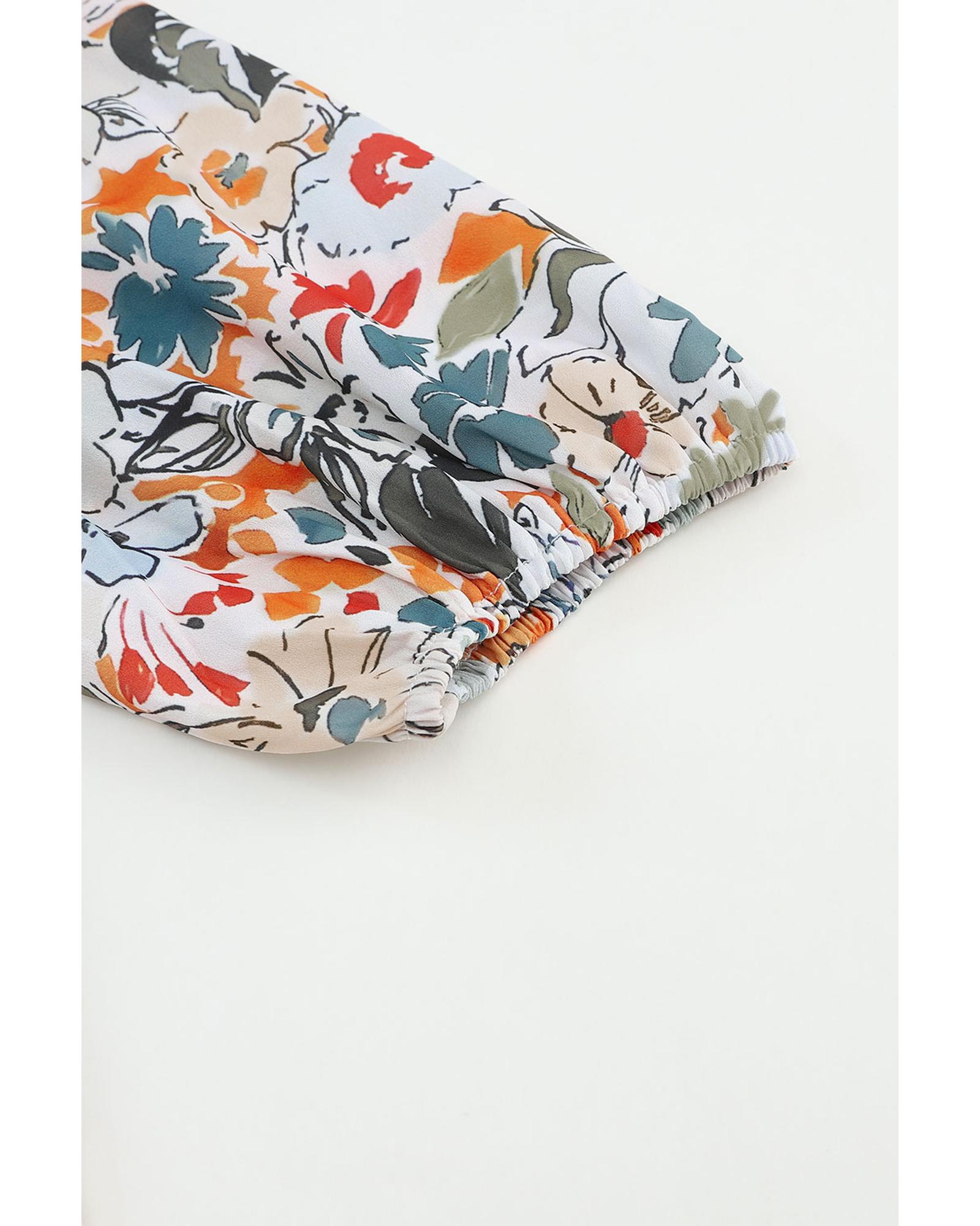 This multicolor split V neck blouse features a vibrant flower print and feminine puff sleeves, making it a versatile addition to any wardrobe. Crafted from quality materials, it offers both style and comfort for various occasions.