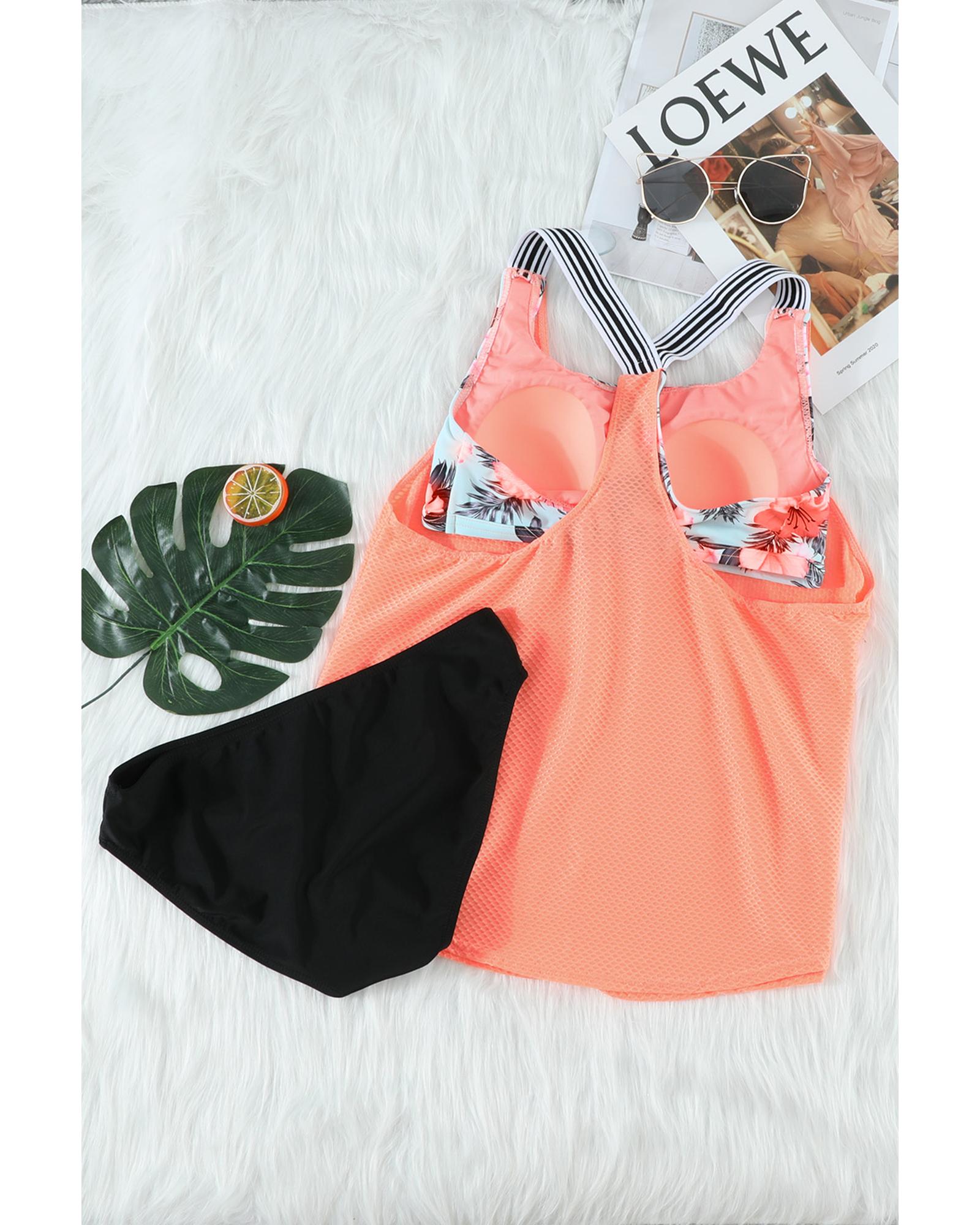This splicing racerback tankini swimsuit offers a stylish and versatile swimwear option. It features a comfortable design with a scoop neck and sleeveless racerback style, suitable for various beach or poolside occasions. The printed splicing detail adds a fashionable touch, while the separate top and bottom allow for mix-and-match styling.