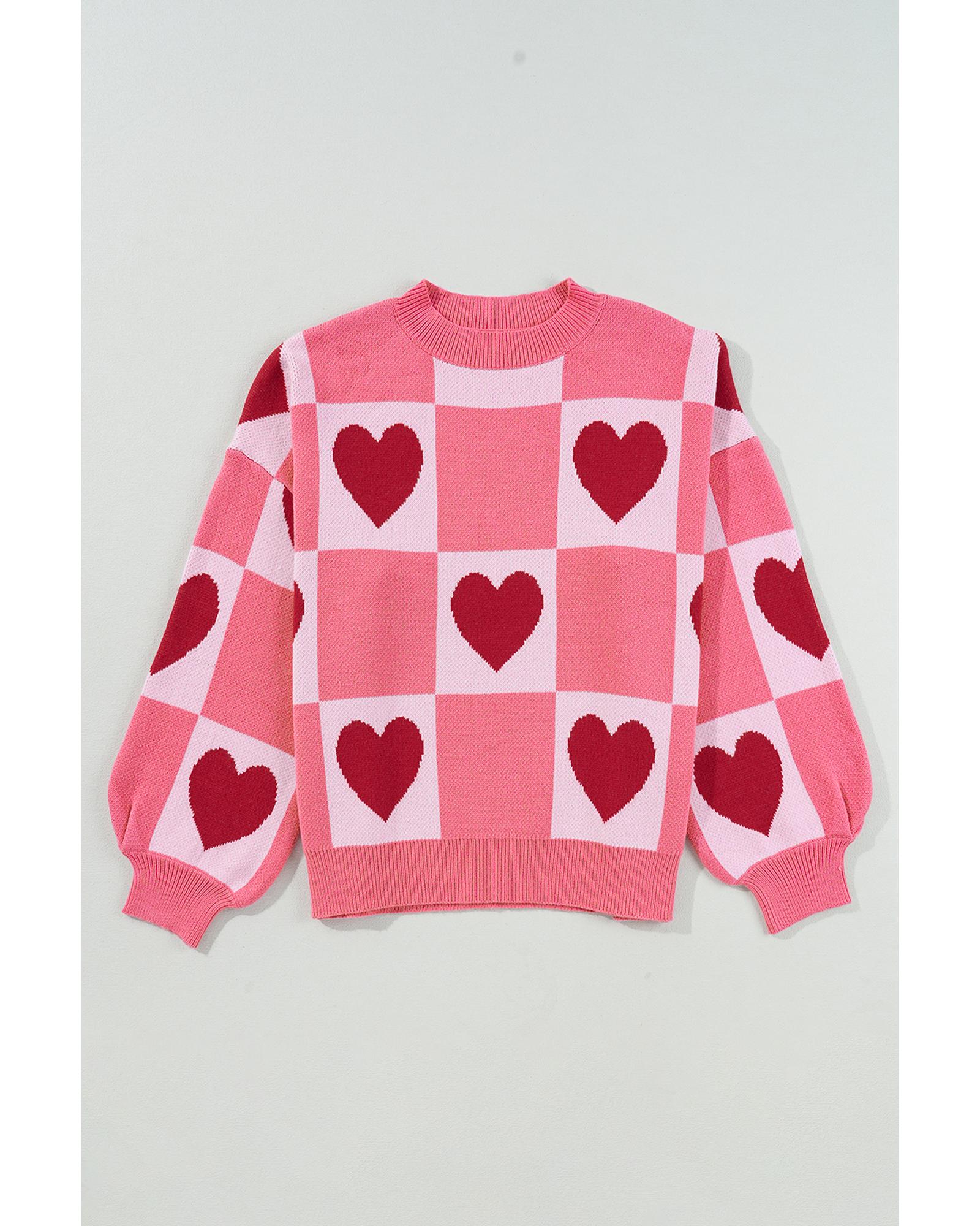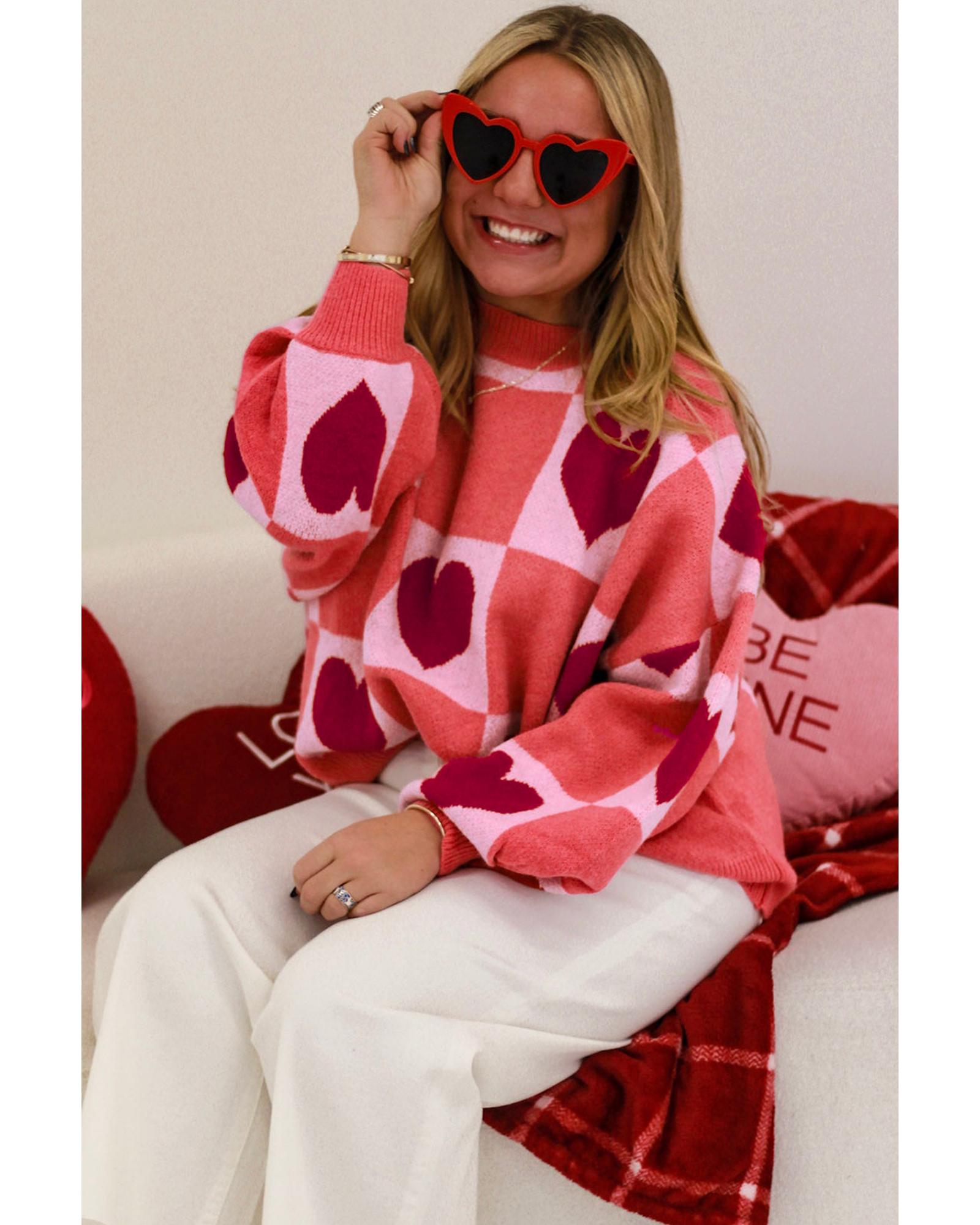 Azura Exchange Pink Plus Size Love Heart Block Mock Neck Lantern Sleeve Valentine Sweater – 1X