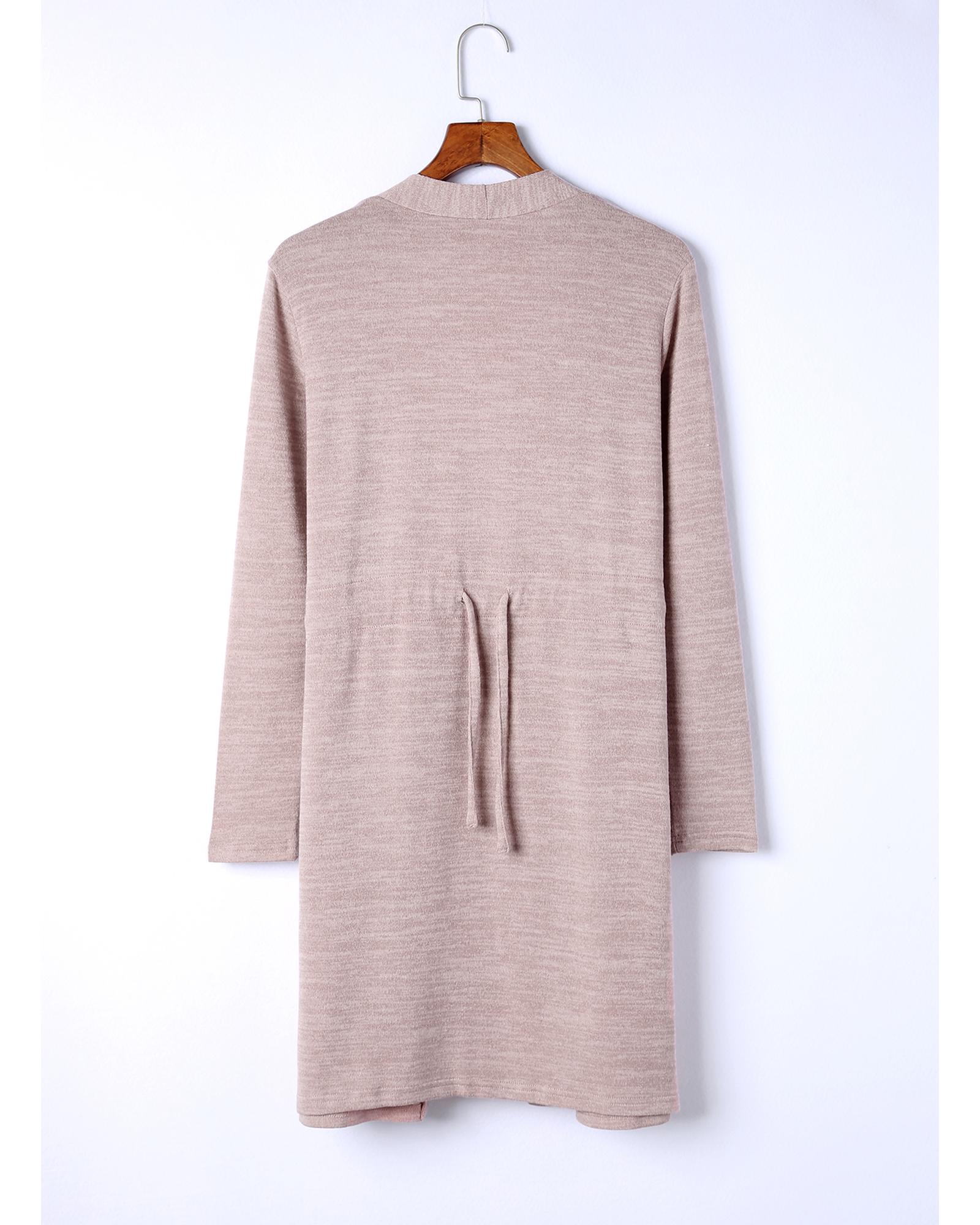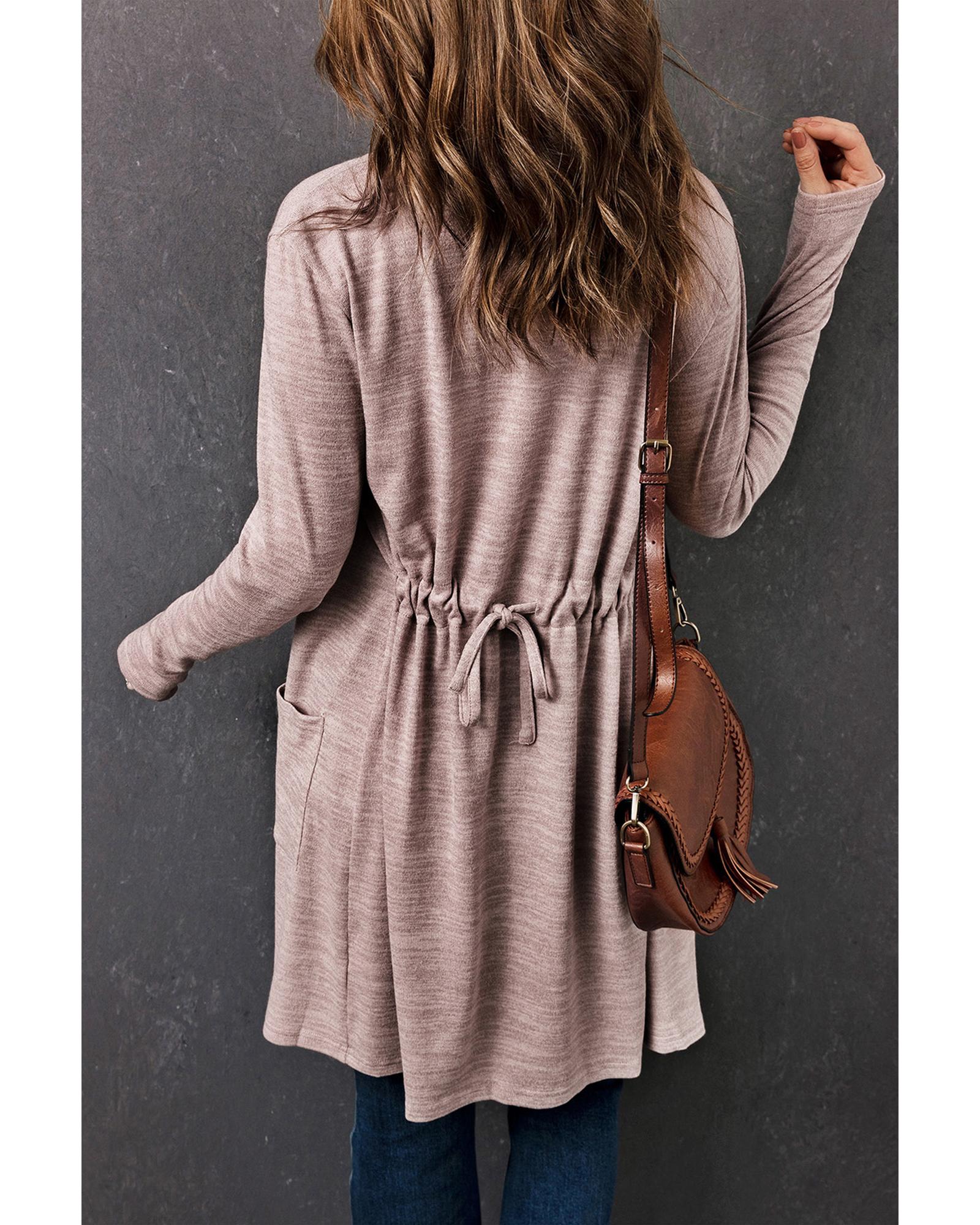 This pink tunic back open front cardigan with pockets is a versatile piece ideal for early fall. Its open front design offers a casual and convenient style, making it a perfect addition to your wardrobe. The long sleeve knit provides comfort, while the front pockets add functionality. An adjustable and chic drawstring back detail enhances the overall look, allowing for a customizable fit.