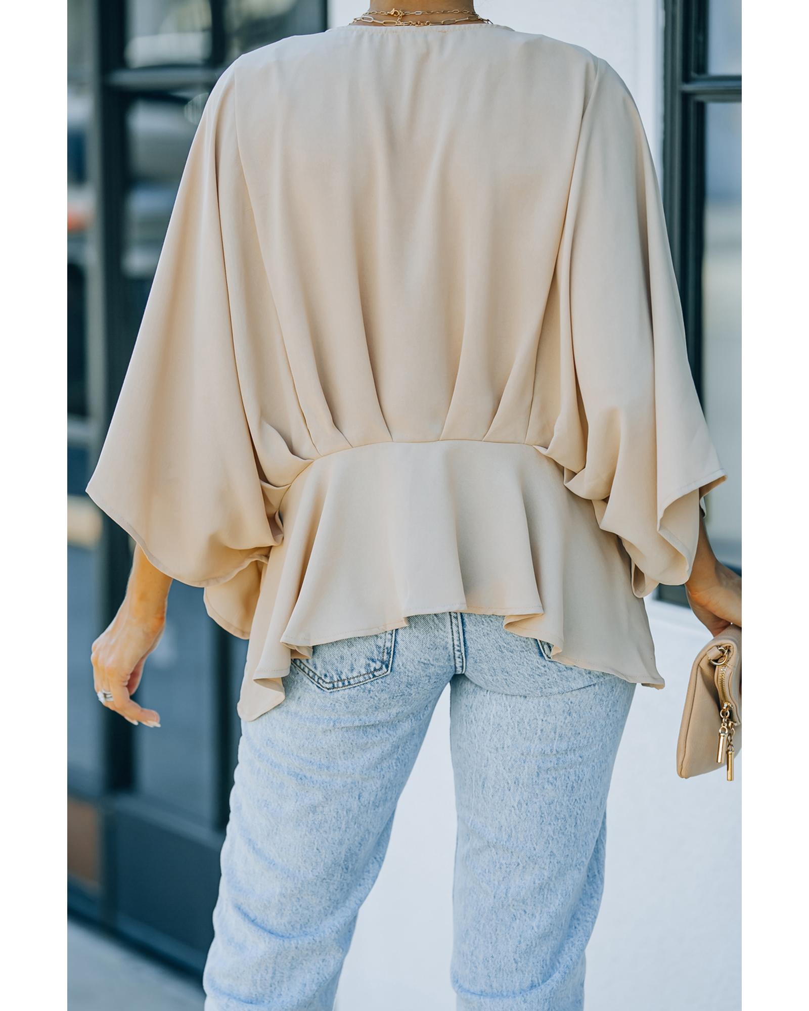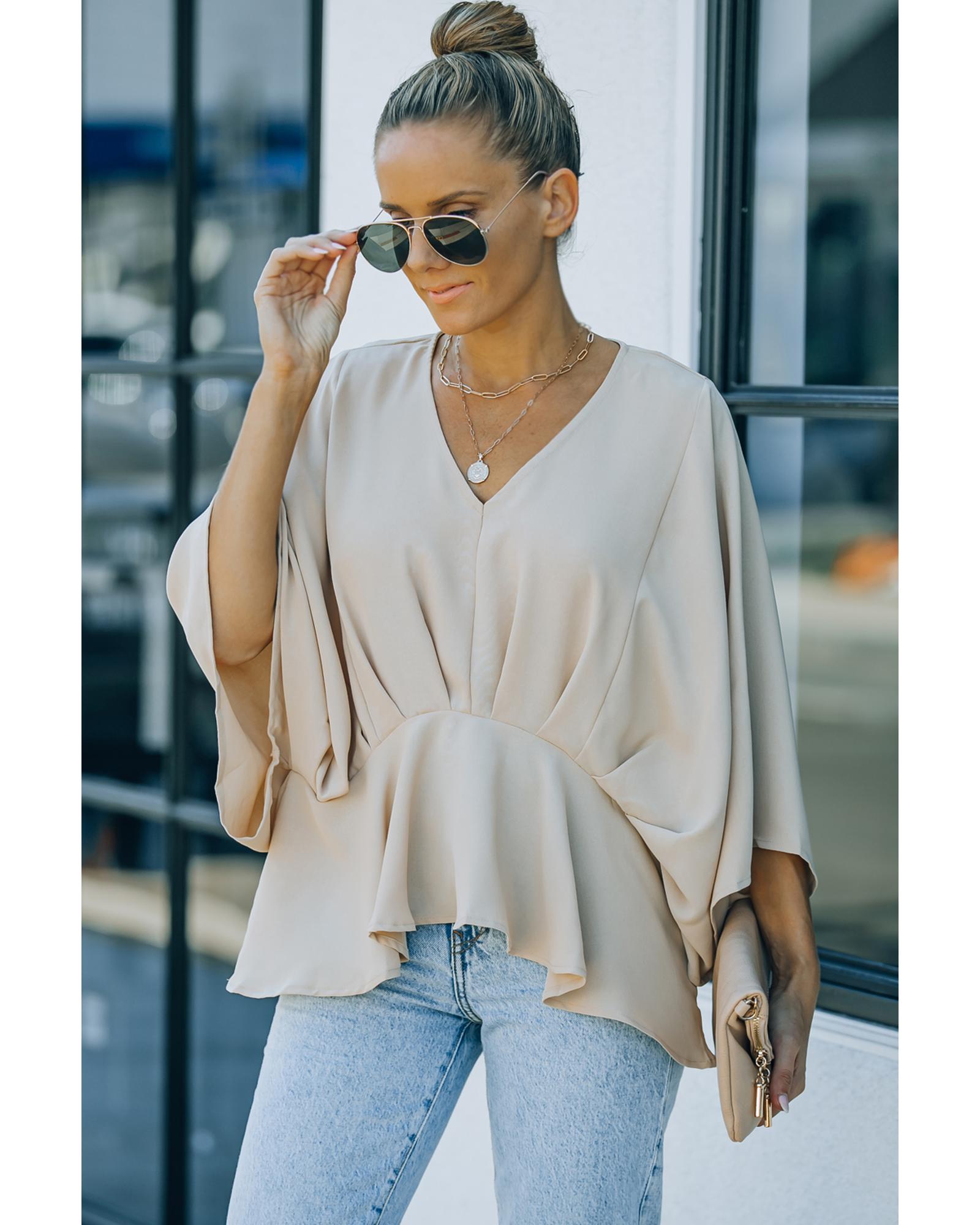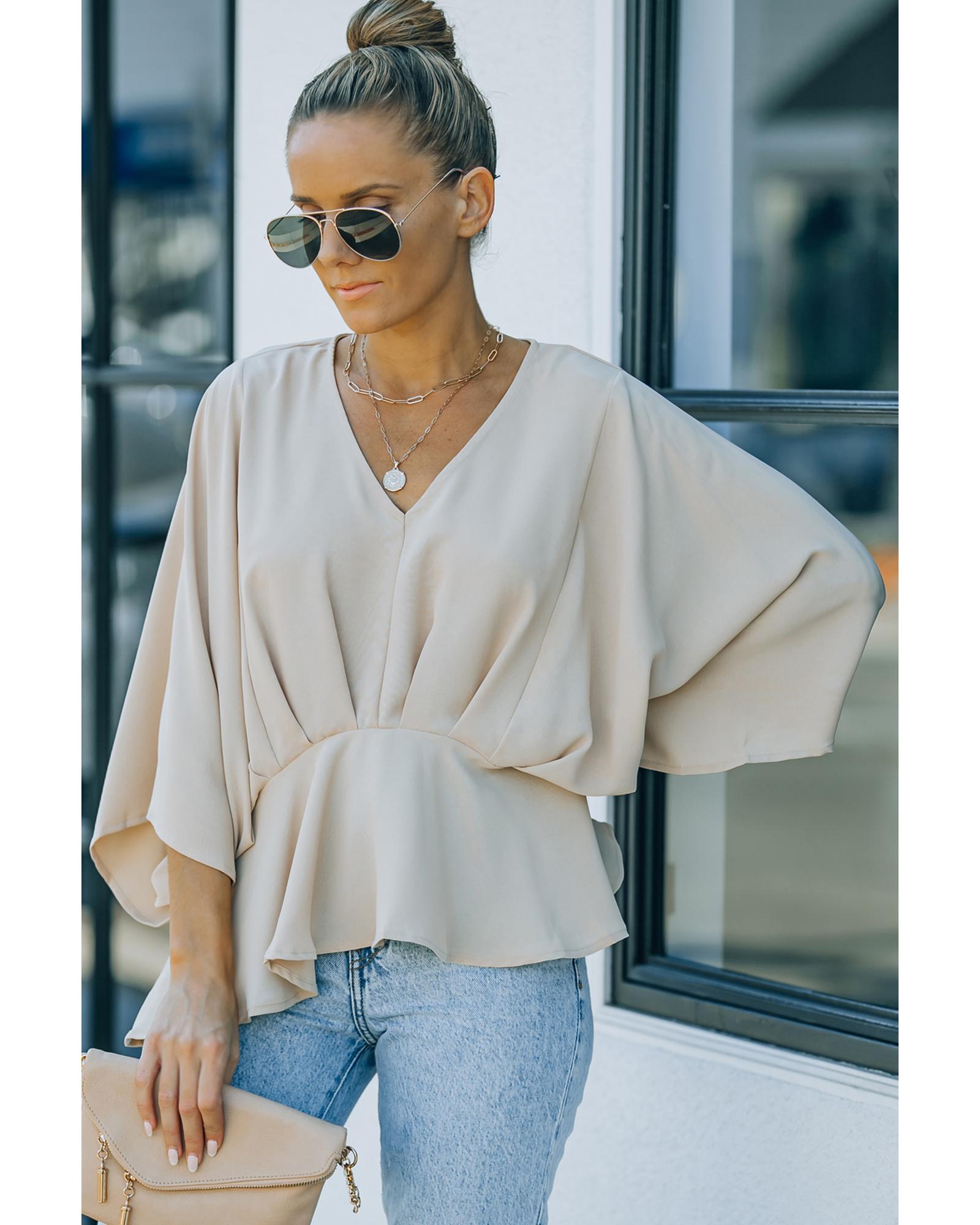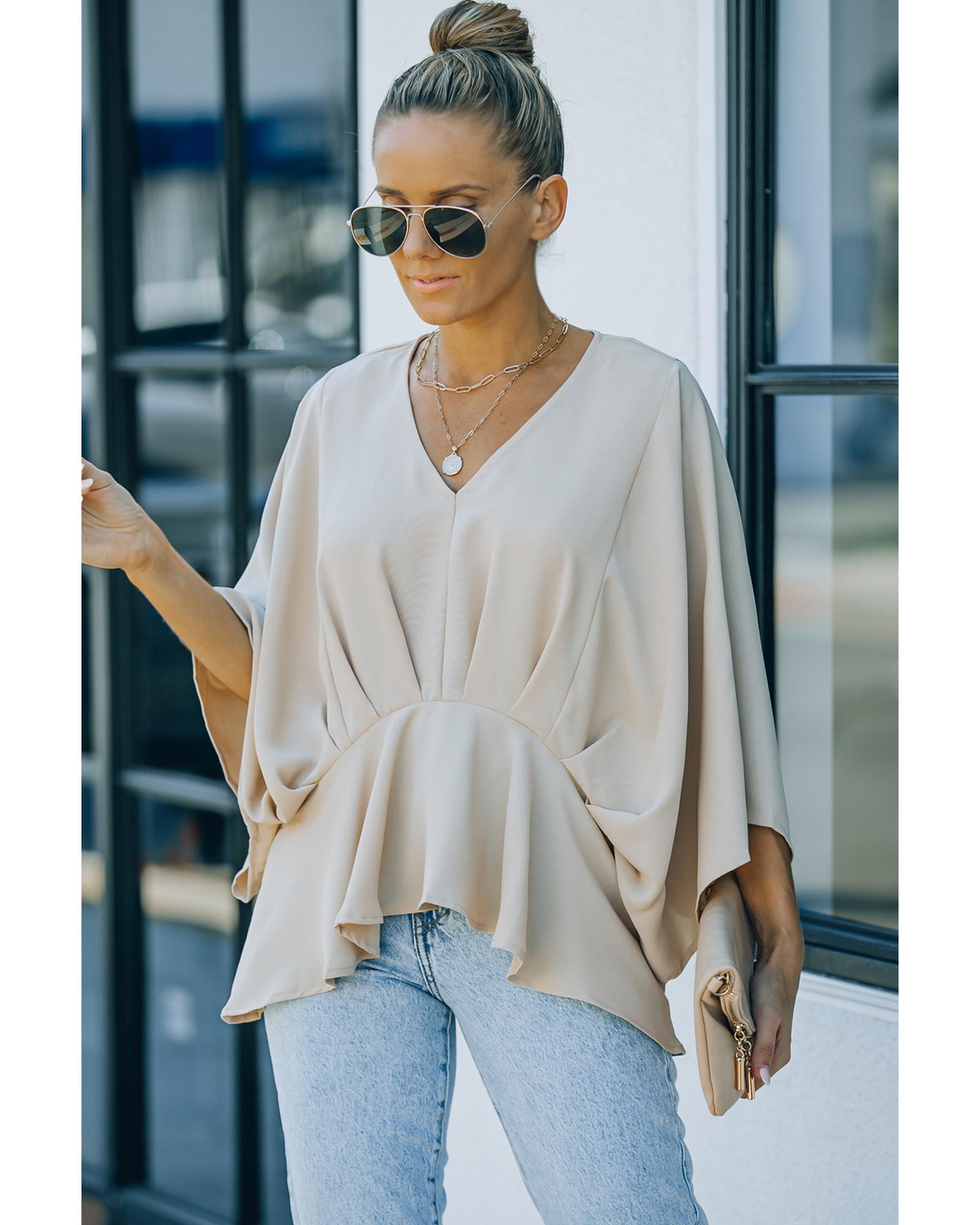 This blouse features a stylish V-neckline and batwing sleeves, offering a comfortable fit with a fashionable touch. The pleated details add an elegant element to the overall design, making it suitable for various occasions. Crafted from high-quality polyester, it combines durability with ease of care.