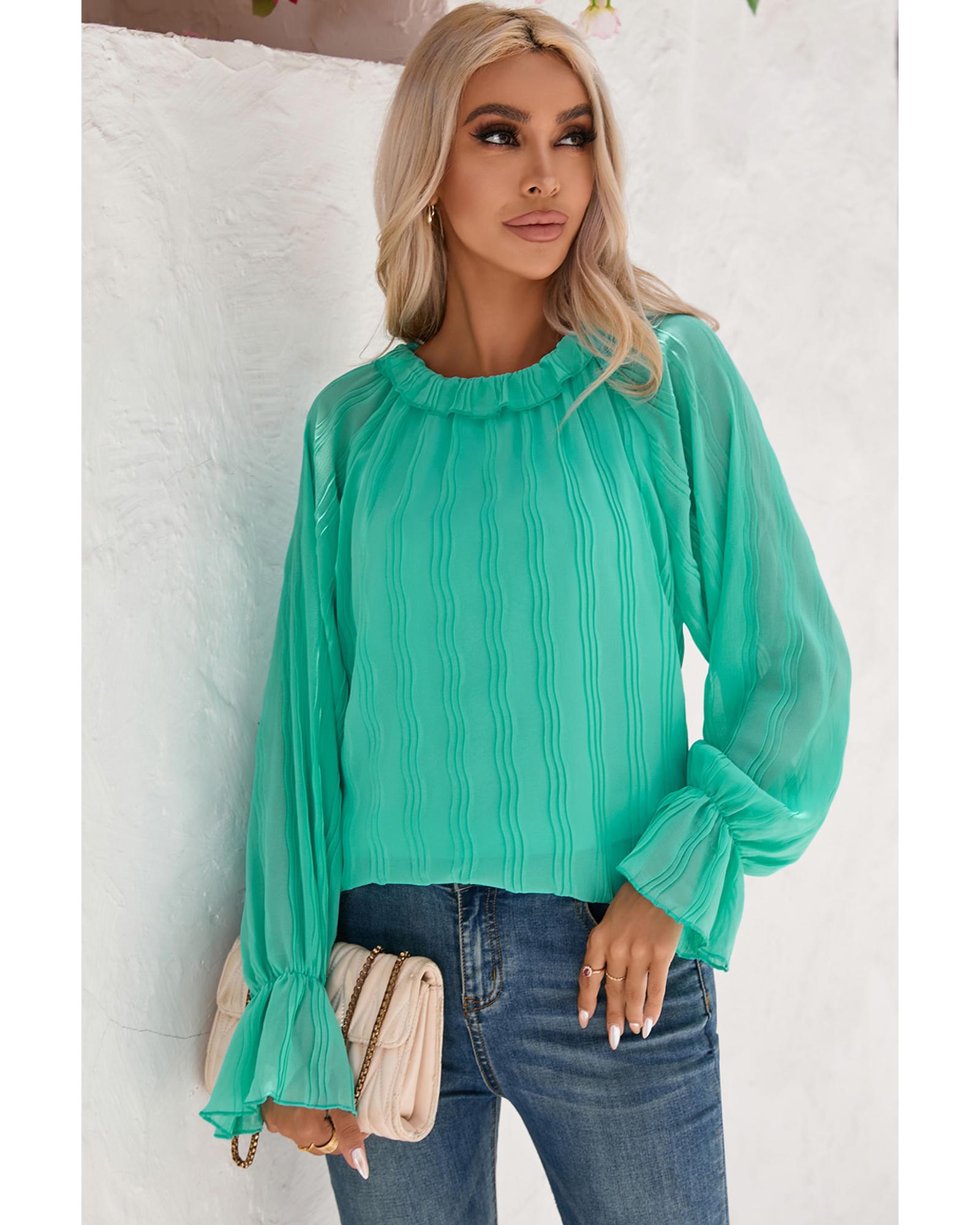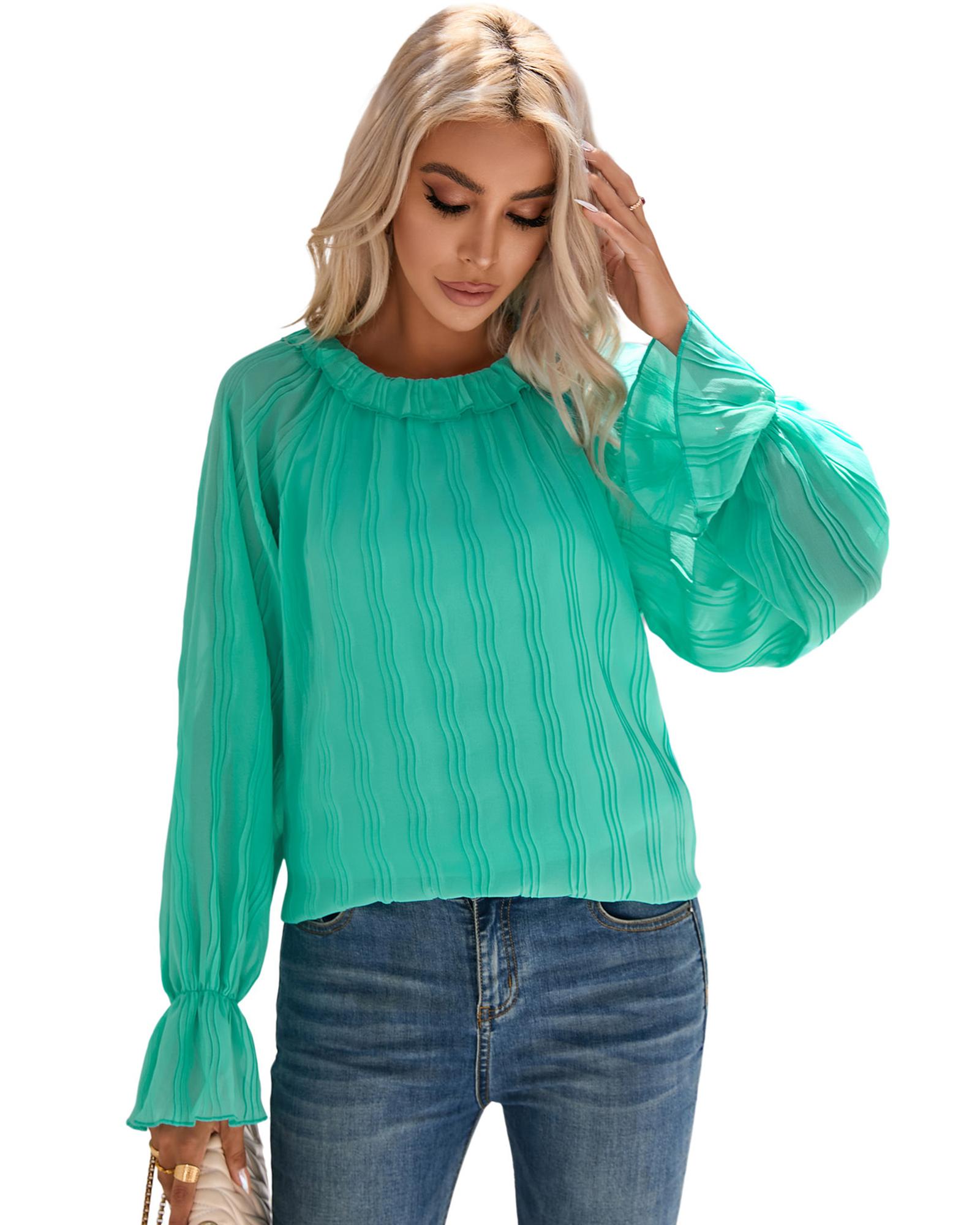 This long sleeve blouse features a luxurious design with striking pleated flared cuffs, combining elegance and sophistication. Crafted from high-quality materials, it offers a comfortable and flattering fit suitable for both formal and casual occasions. Its unique cuff design adds a distinctive touch to any wardrobe.