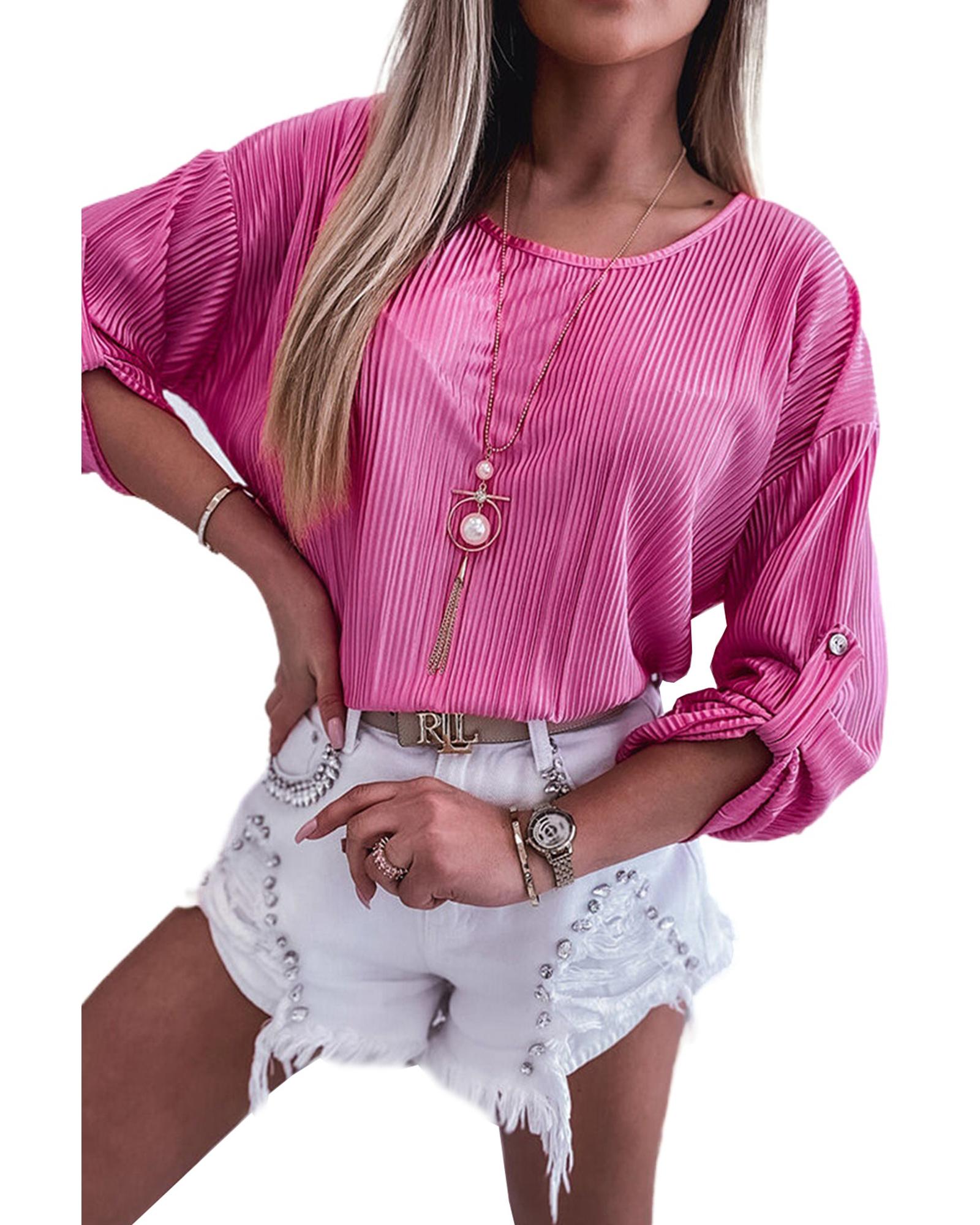 This pleated texture roll tab sleeve blouse offers a versatile and elegant option for women, suitable for both casual and formal occasions. Its unique pleated design adds depth and visual interest, while the roll tab sleeves provide adjustable comfort and style. Crafted with attention to detail, this blouse combines quality craftsmanship with a sophisticated look, making it a versatile addition to any wardrobe.