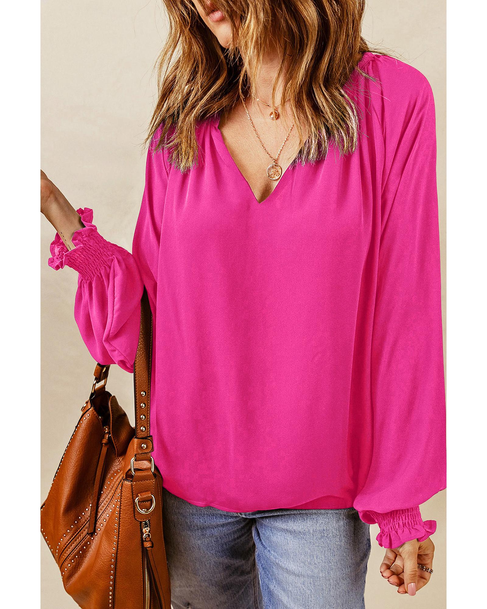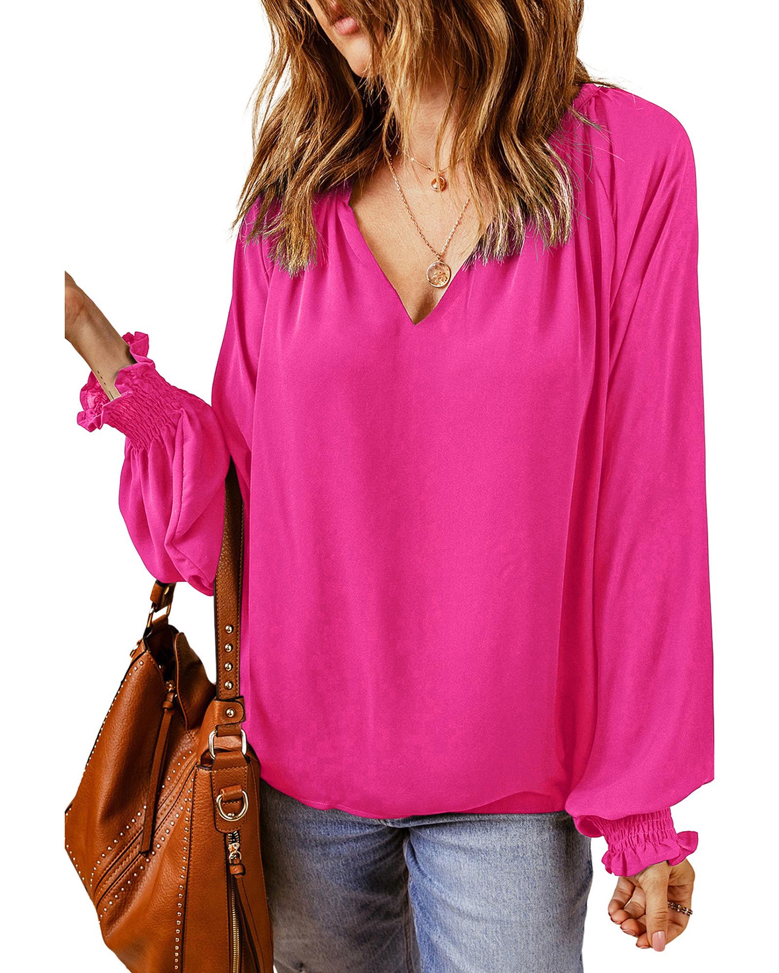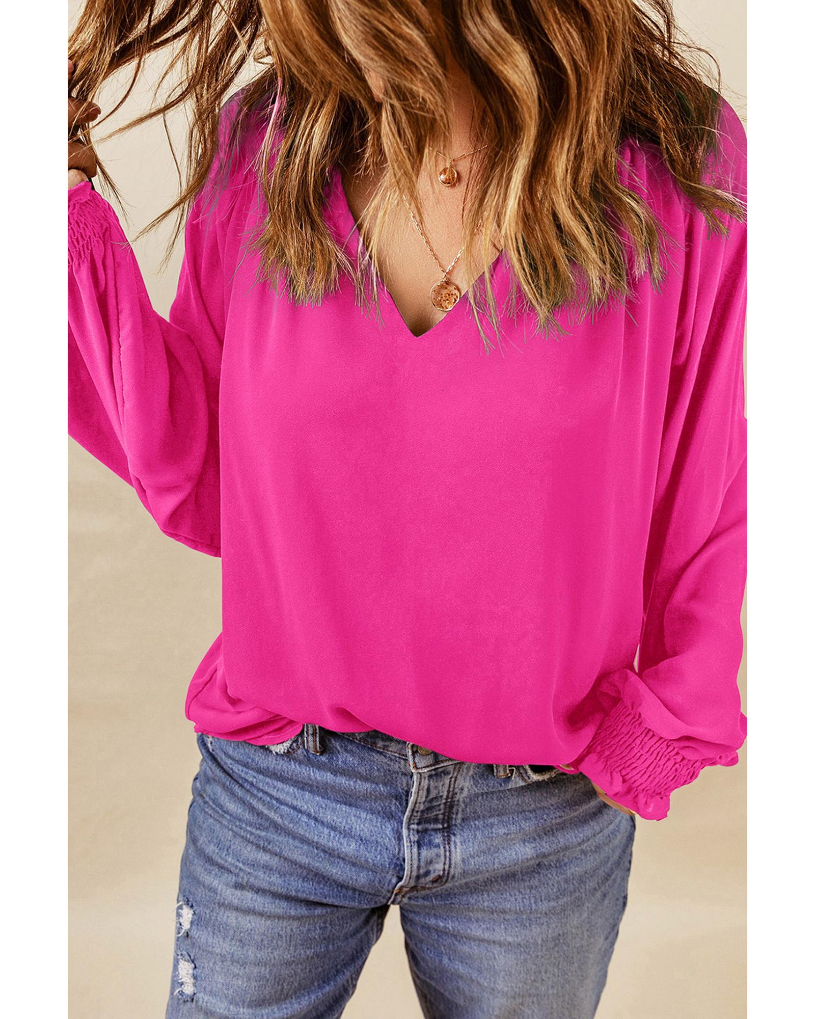 This pleated V neck blouse features a stylish design with playful puffy sleeves and textured pleated detailing. It offers a flattering fit suitable for various occasions, combining comfort and durability with high-quality materials.