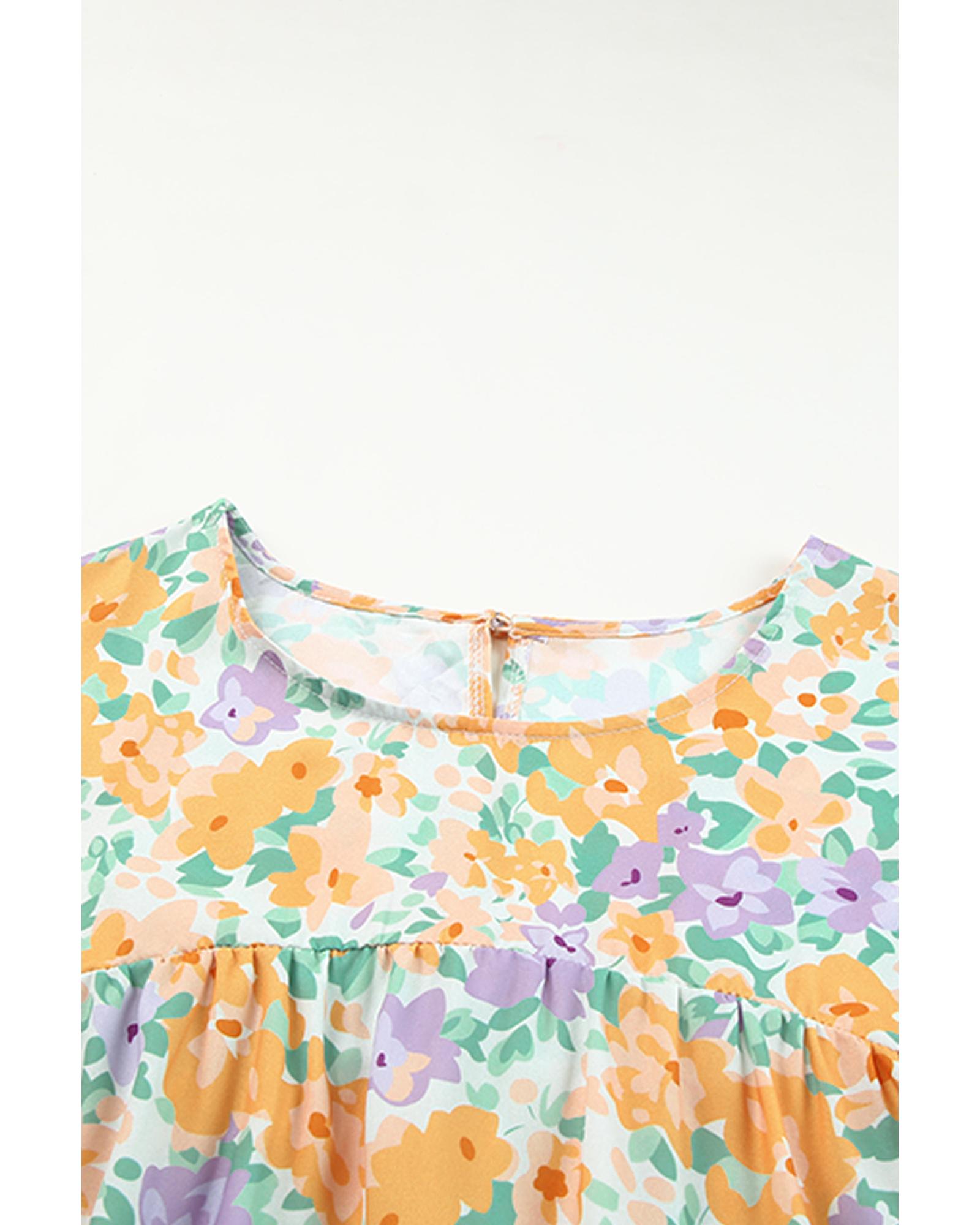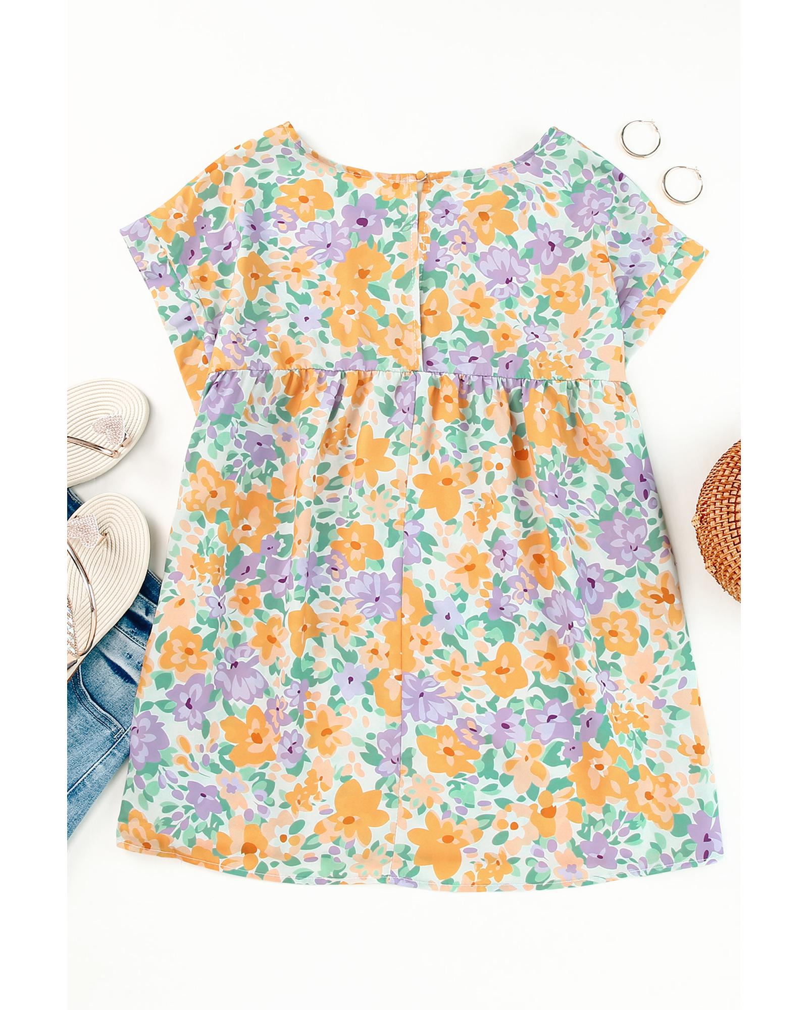 This floral print short sleeve babydoll blouse features a fashionable and feminine design with a trendy keyhole back detail. It is perfect for adding a pop of color and style to any outfit, combining comfort and style effortlessly.