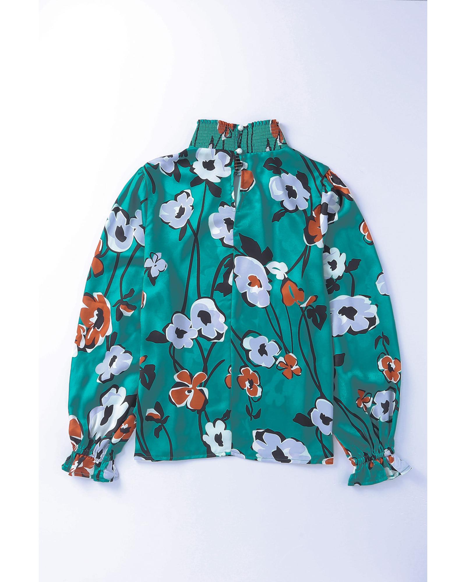 This floral print smocked mock neck blouse is a stylish and feminine addition to any wardrobe. It features a beautiful floral pattern and a trendy smocked mock neck, offering an elegant and sophisticated look. Made from high-quality materials, it provides comfort and a luxurious feel. This versatile blouse can be dressed up or down, making it suitable for both casual and formal occasions.