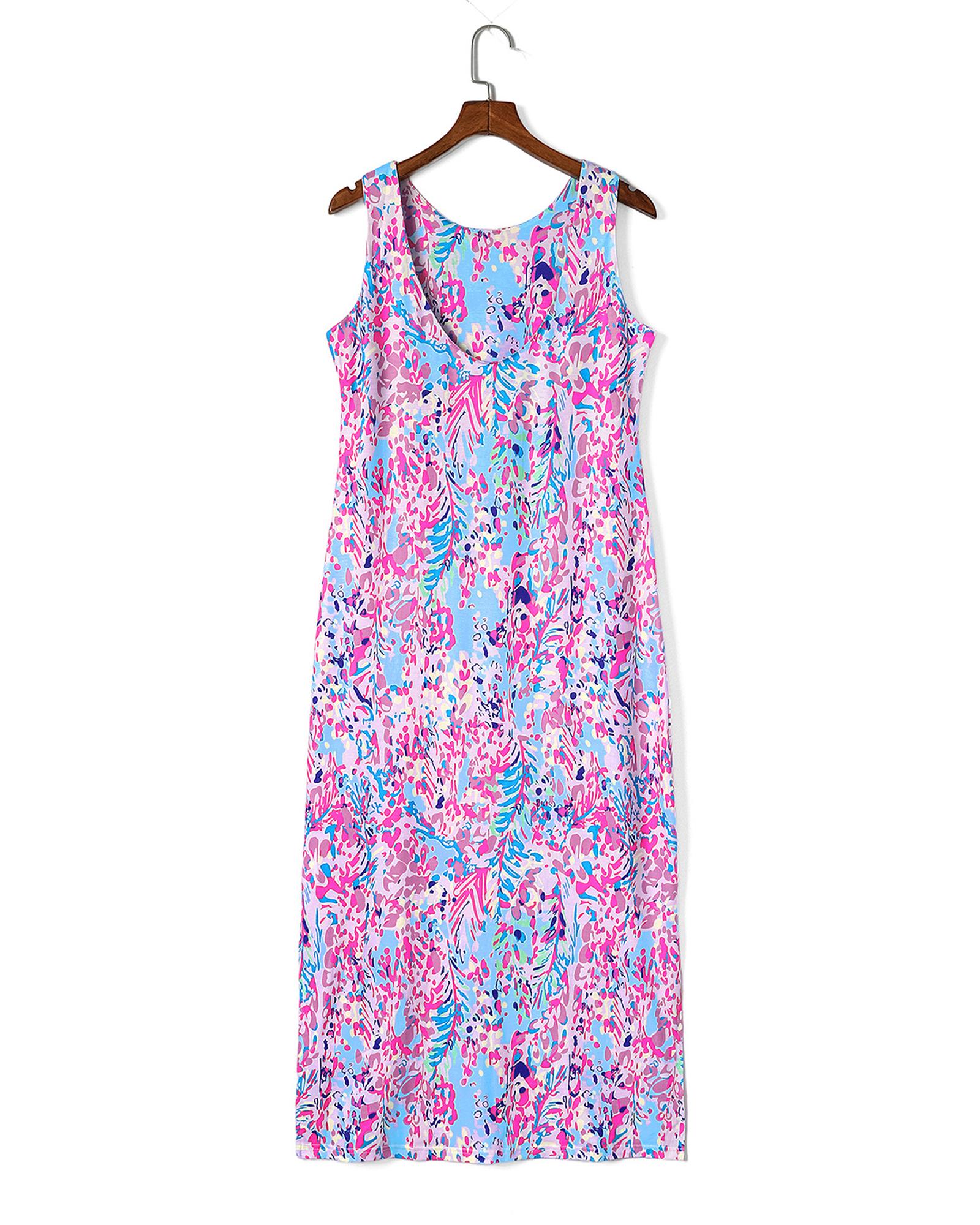 This sleeveless maxi dress features a vibrant floral print and a comfortable crew neckline, making it suitable for various occasions such as weddings, parties, date nights, or casual outings. Its ankle-length design offers full coverage, while side slits add a touch of style and ease of movement. The allover pattern enhances its visual appeal, making it a practical and fashionable addition to any wardrobe.