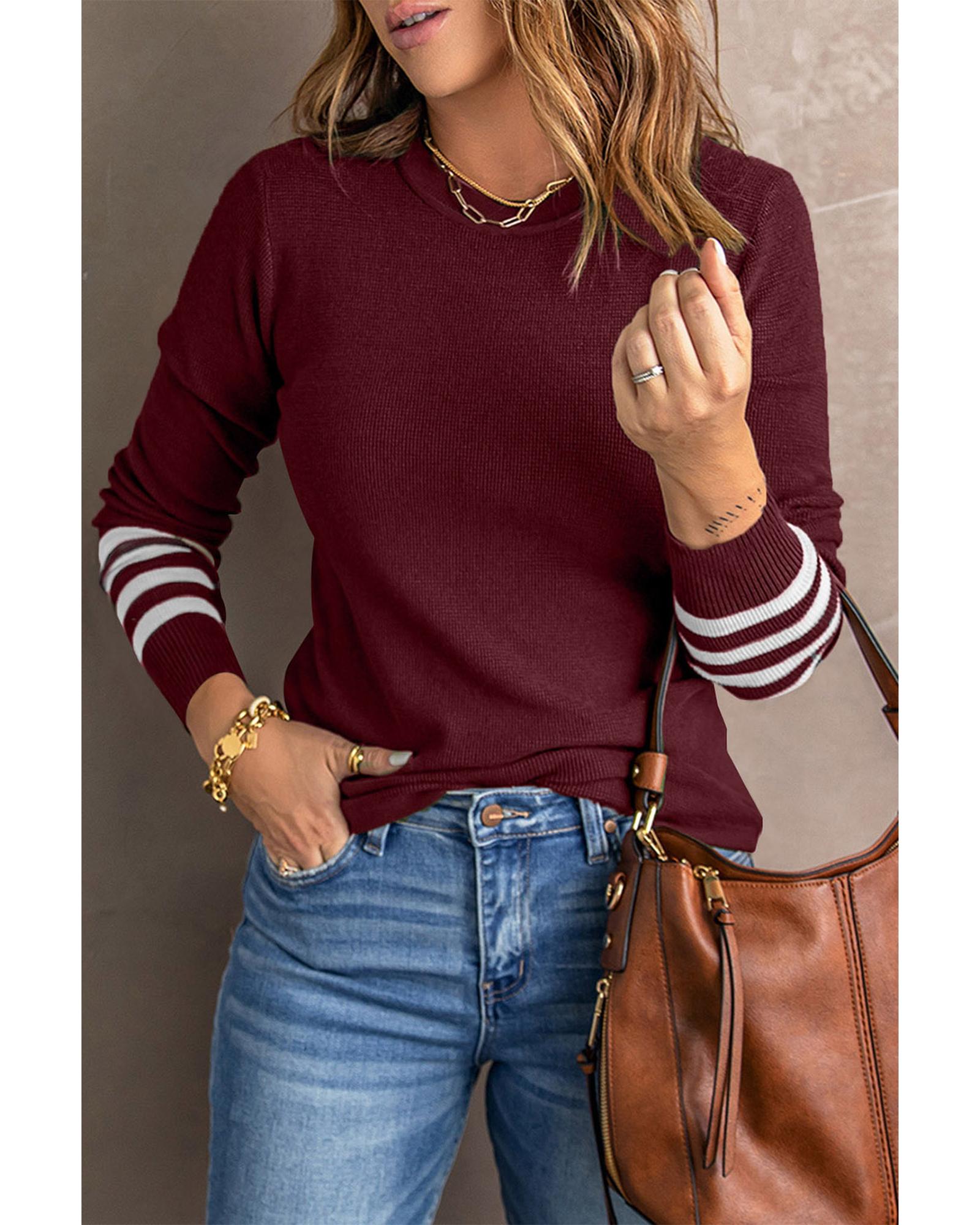 This plain knit sweater features a classic crew neck design with striped sleeves, combining simplicity with a touch of fashion. Made from a soft, stretchy material, it offers comfort and versatility for various occasions such as office parties and dates.