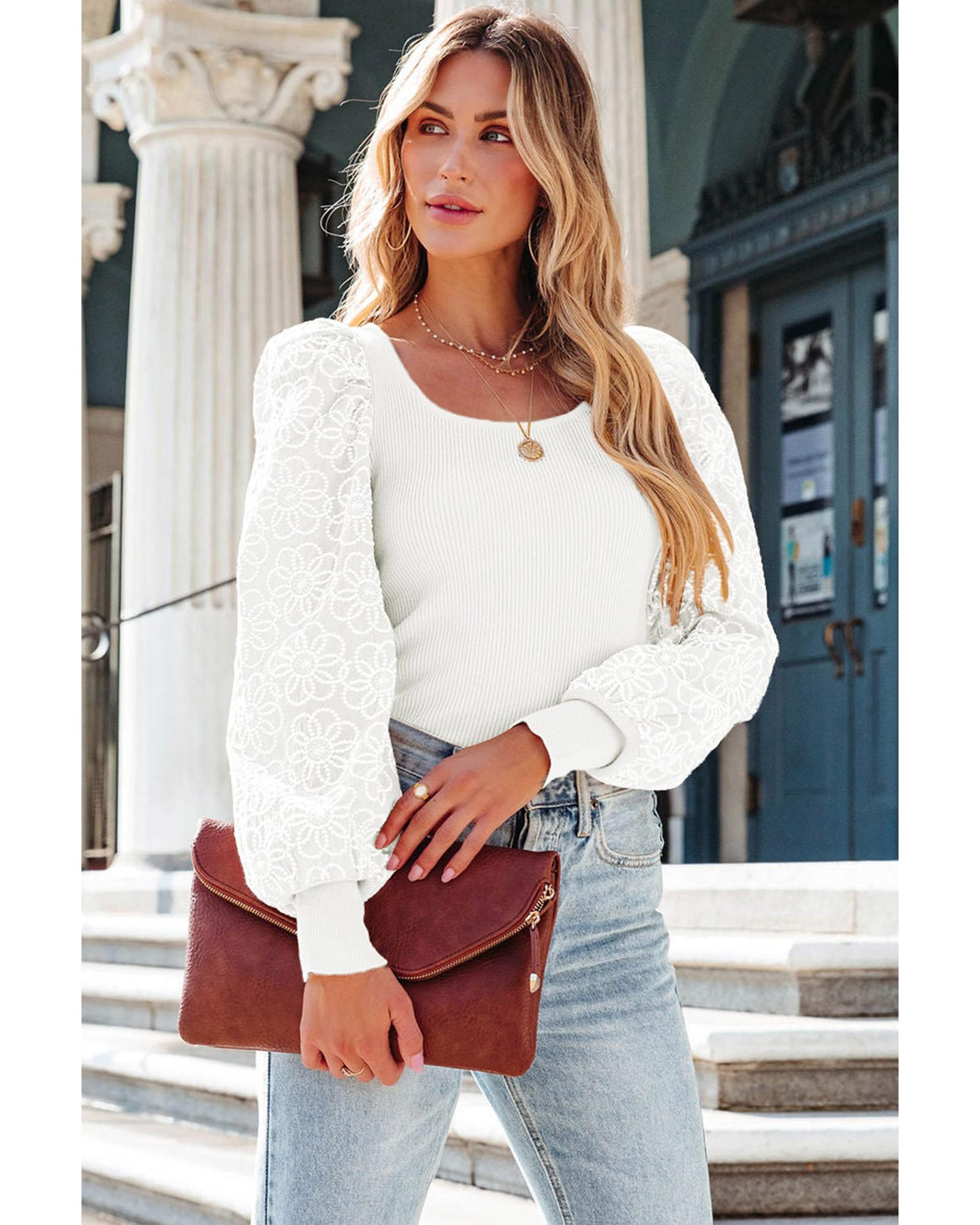 This ribbed knit puff sleeve top features a luxurious floral design with feminine details. Crafted from high-quality materials, it offers a stylish and versatile option suitable for various occasions. The textured ribbed fabric and puff sleeves add a fashionable touch, making it easy to dress up or down.