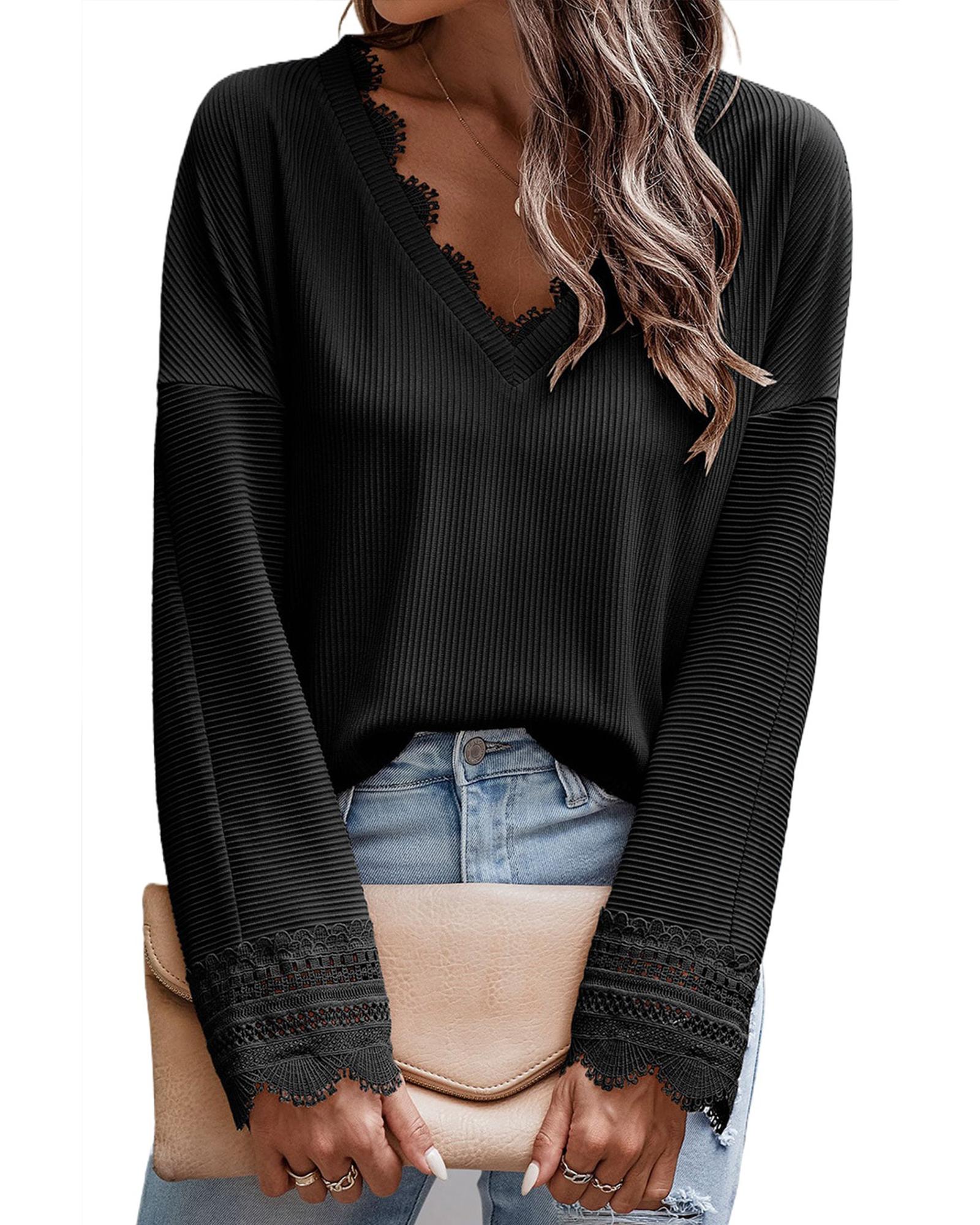 This versatile and stylish black top features a ribbed texture and a feminine V neck with lace trim. Its long sleeves offer coverage and warmth, making it suitable for various occasions. Crafted from high-quality materials, it ensures comfort and durability for everyday wear.