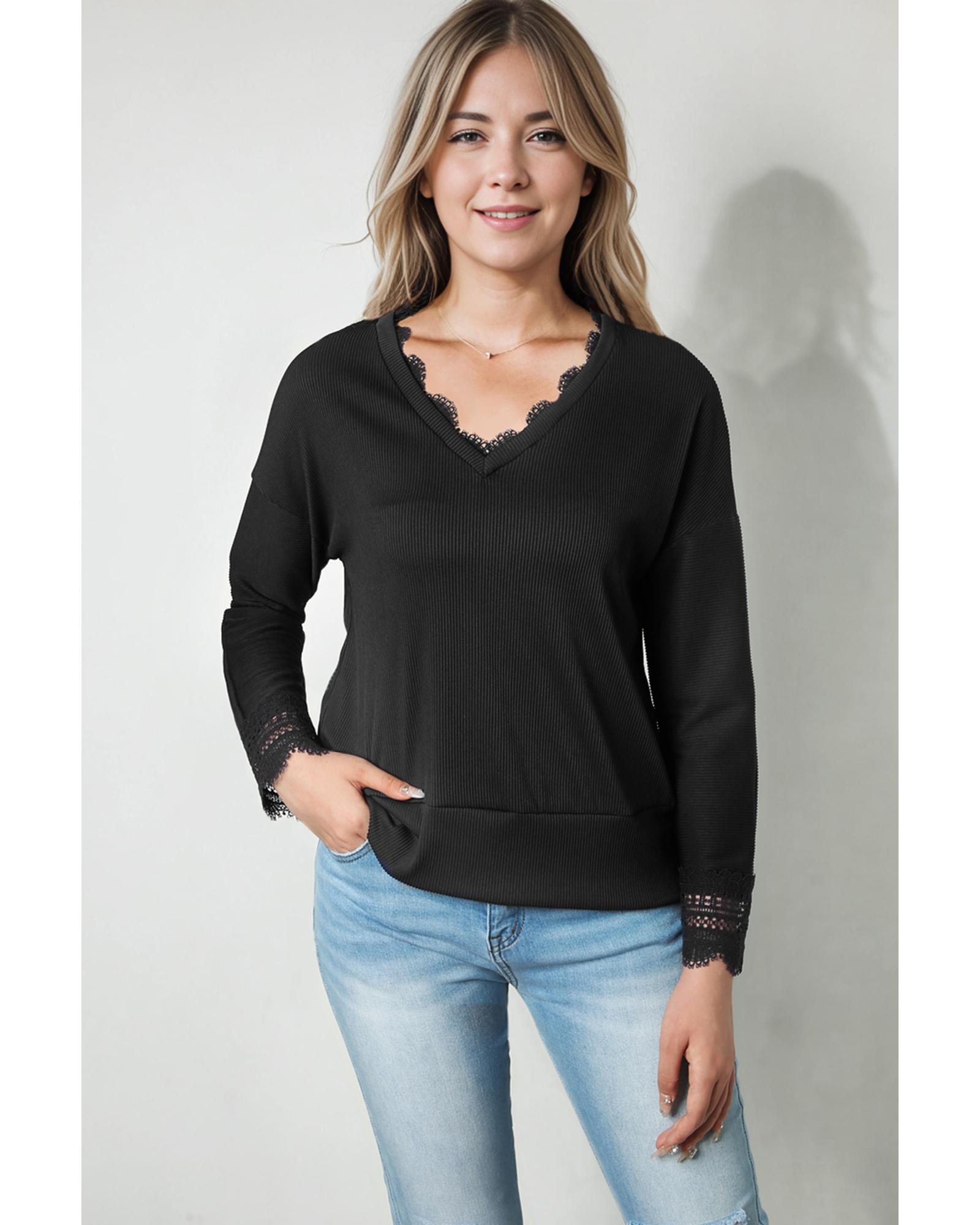 This versatile and stylish black top features a ribbed texture and a feminine V neck with lace trim. Its long sleeves offer coverage and warmth, making it suitable for various occasions. Crafted from high-quality materials, it ensures comfort and durability for everyday wear.