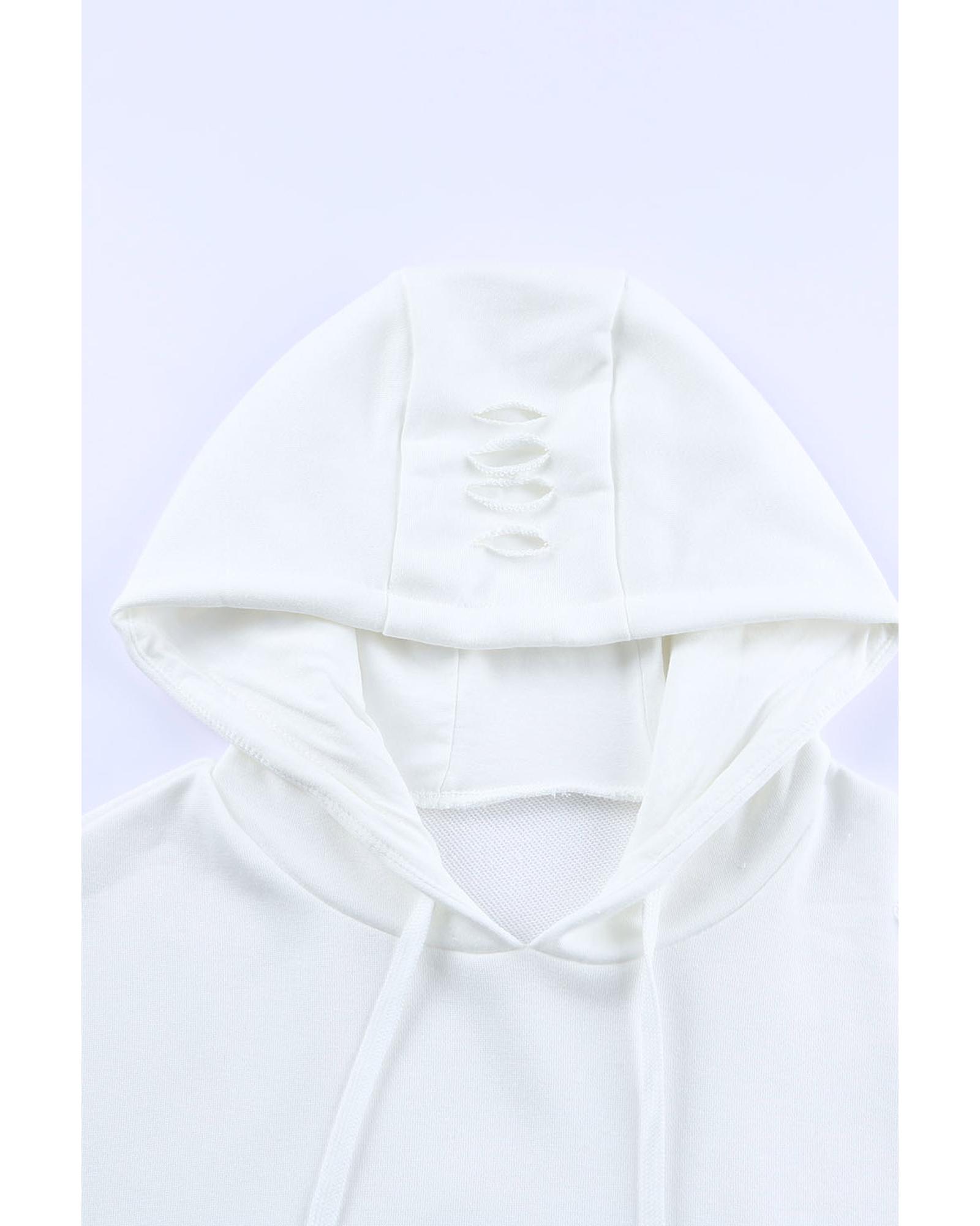 This ripped hooded sweatshirt features a minimalist design with a solid color, making it a versatile and stylish choice for everyday wear. It is designed specifically for women, combining comfort with trendy fashion elements. The sweatshirt includes a hood and a kangaroo pocket, offering practicality and a relaxed fit.