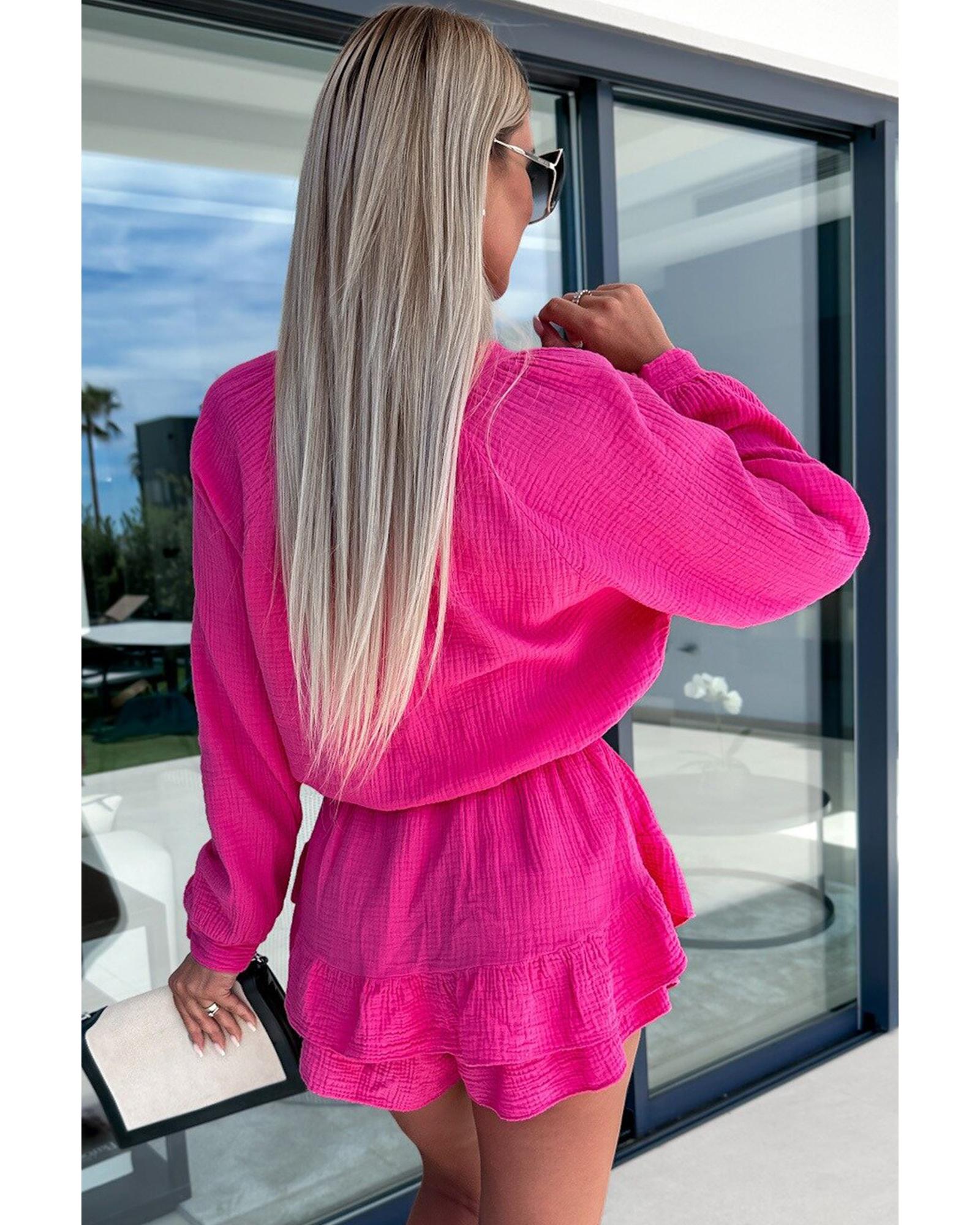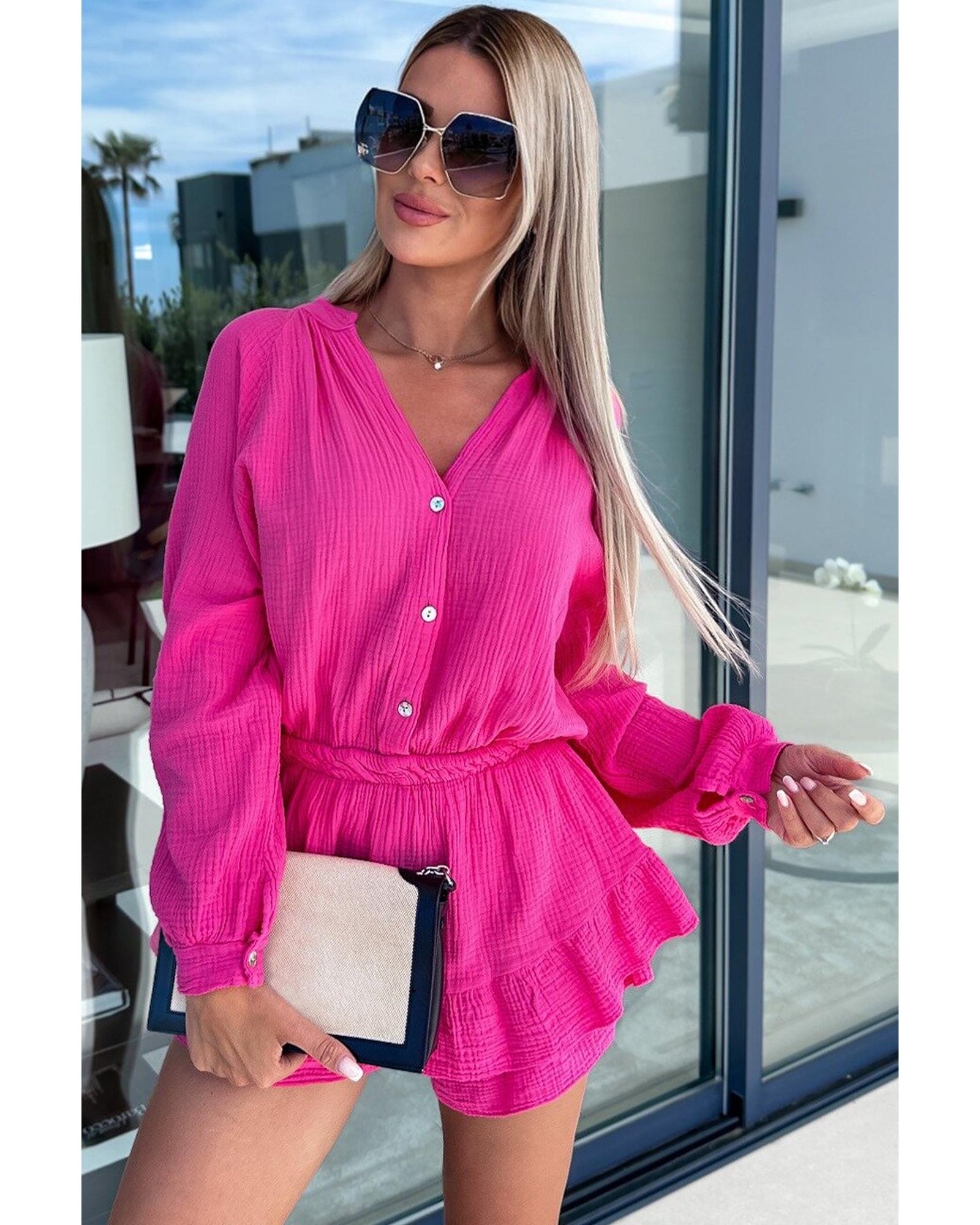 Azura Exchange Rose Textured Tiered Ruffled Buttoned Long Sleeve Romper – M
