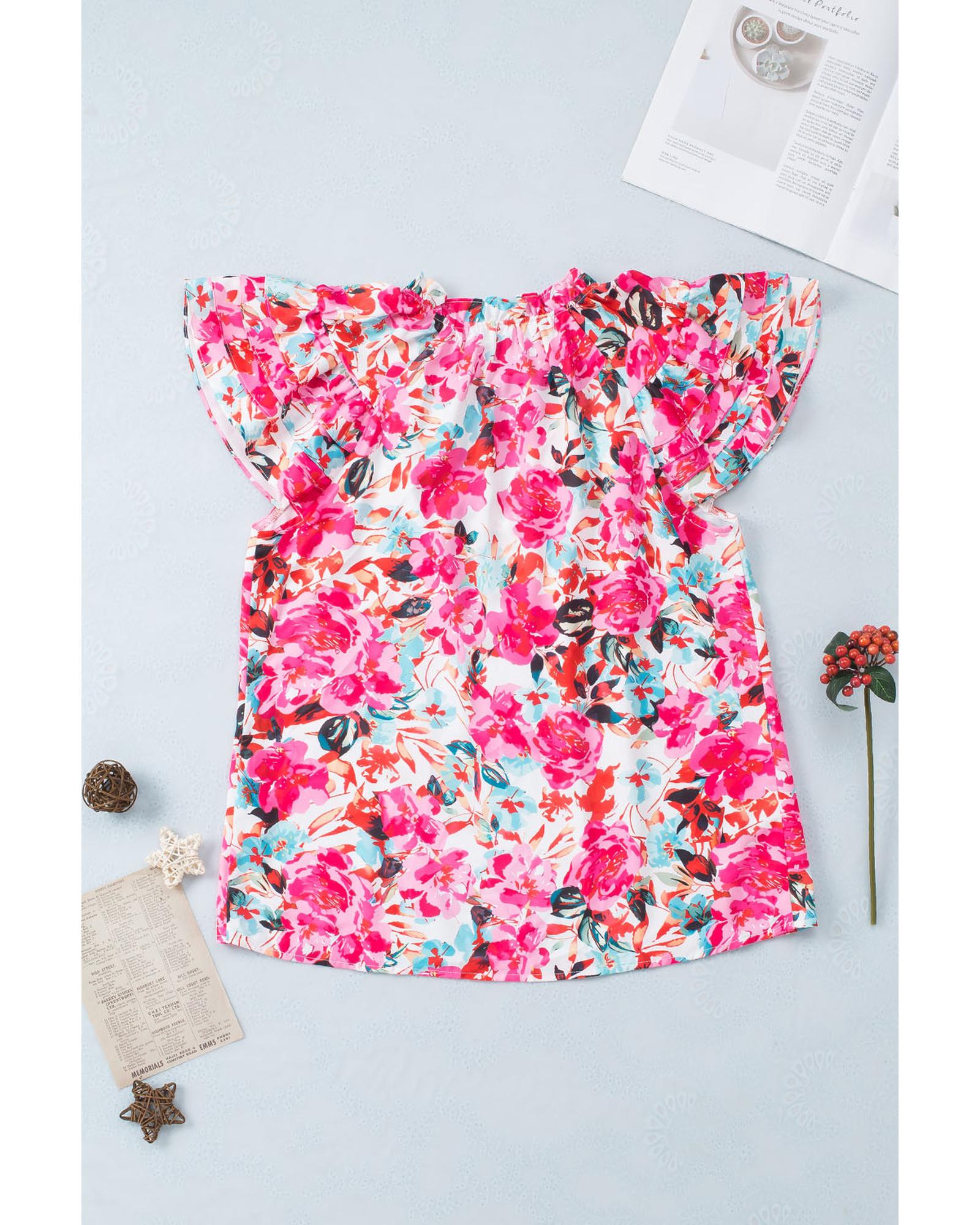 This floral print blouse features ruffle flutter sleeves that add a feminine and elegant touch. Its stylish design makes it suitable for various occasions, whether paired with jeans or a skirt. Crafted from quality materials, it offers both comfort and durability, making it a versatile addition to any wardrobe.