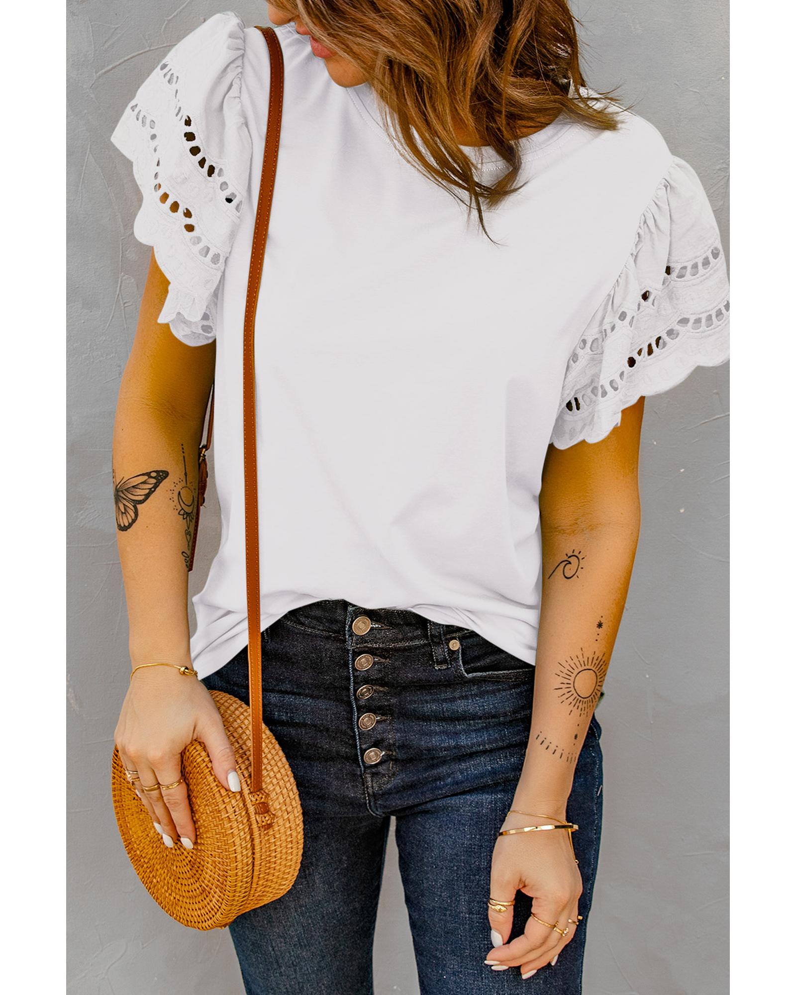 This stylish and trendy hollow out ruffle sleeve T-shirt is designed for women, offering a fashionable addition to any wardrobe. It features ruffle sleeves and a unique hollow out design that adds a touch of femininity to your look. Made from high-quality materials, it provides comfort and durability, making it suitable for both casual and dressed-up outfits. This versatile piece can be paired with jeans or a skirt to elevate your style.