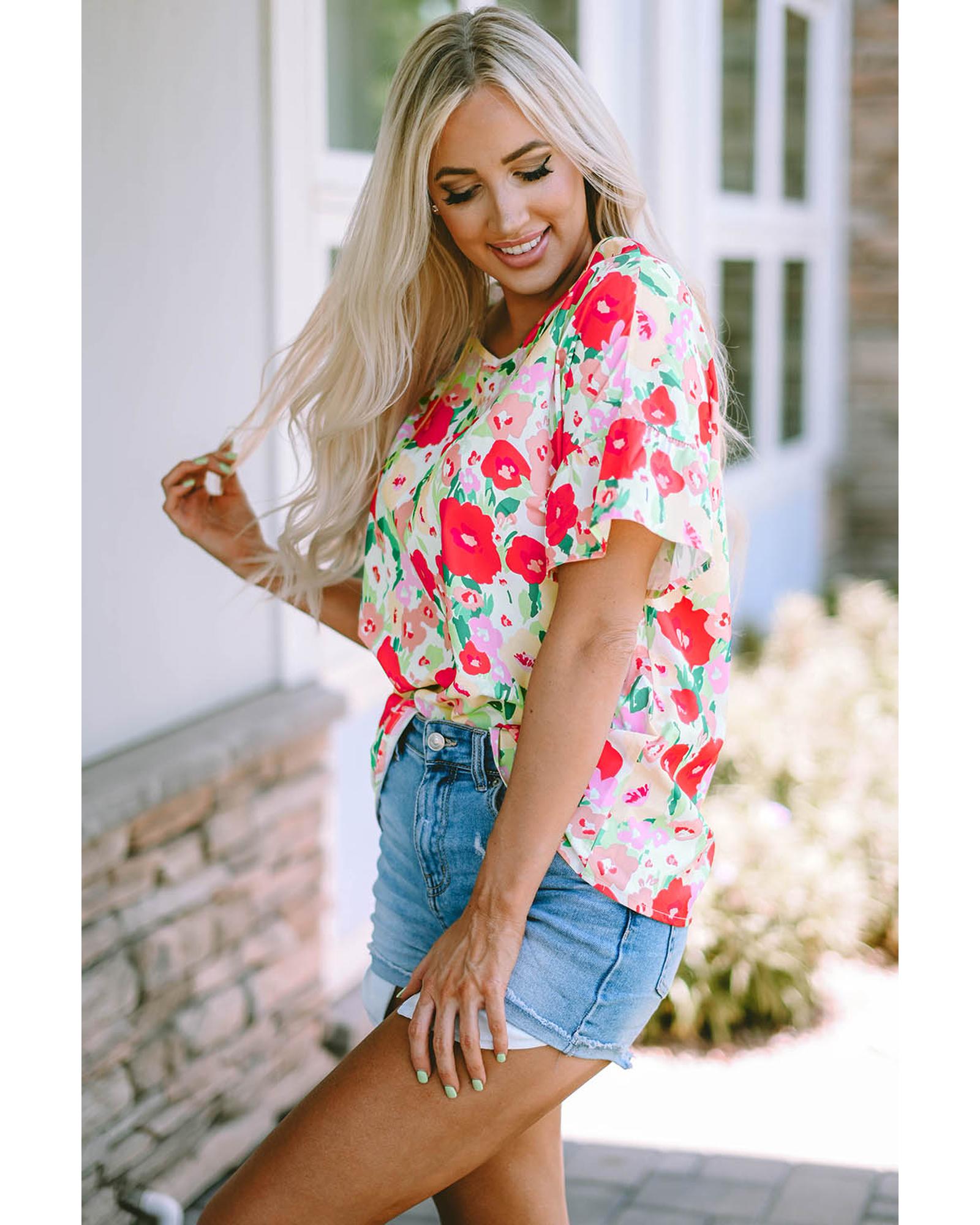 This floral print blouse features a stylish ruffled V-neckline and short sleeves, offering a flattering silhouette suitable for various occasions. Made from quality materials, it combines versatility and elegance for everyday wear or special events.