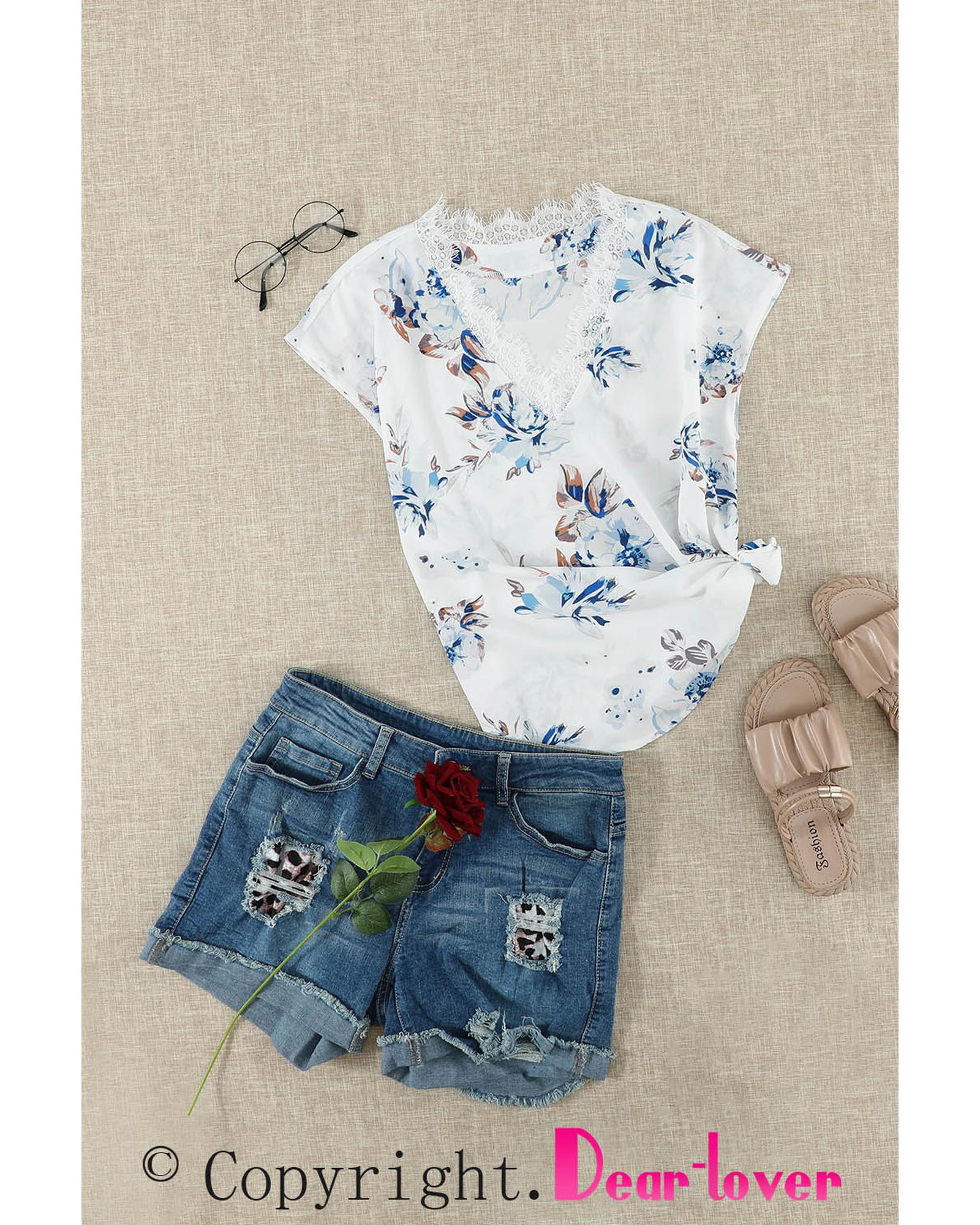 • Floral scalloped V neck short sleeves top