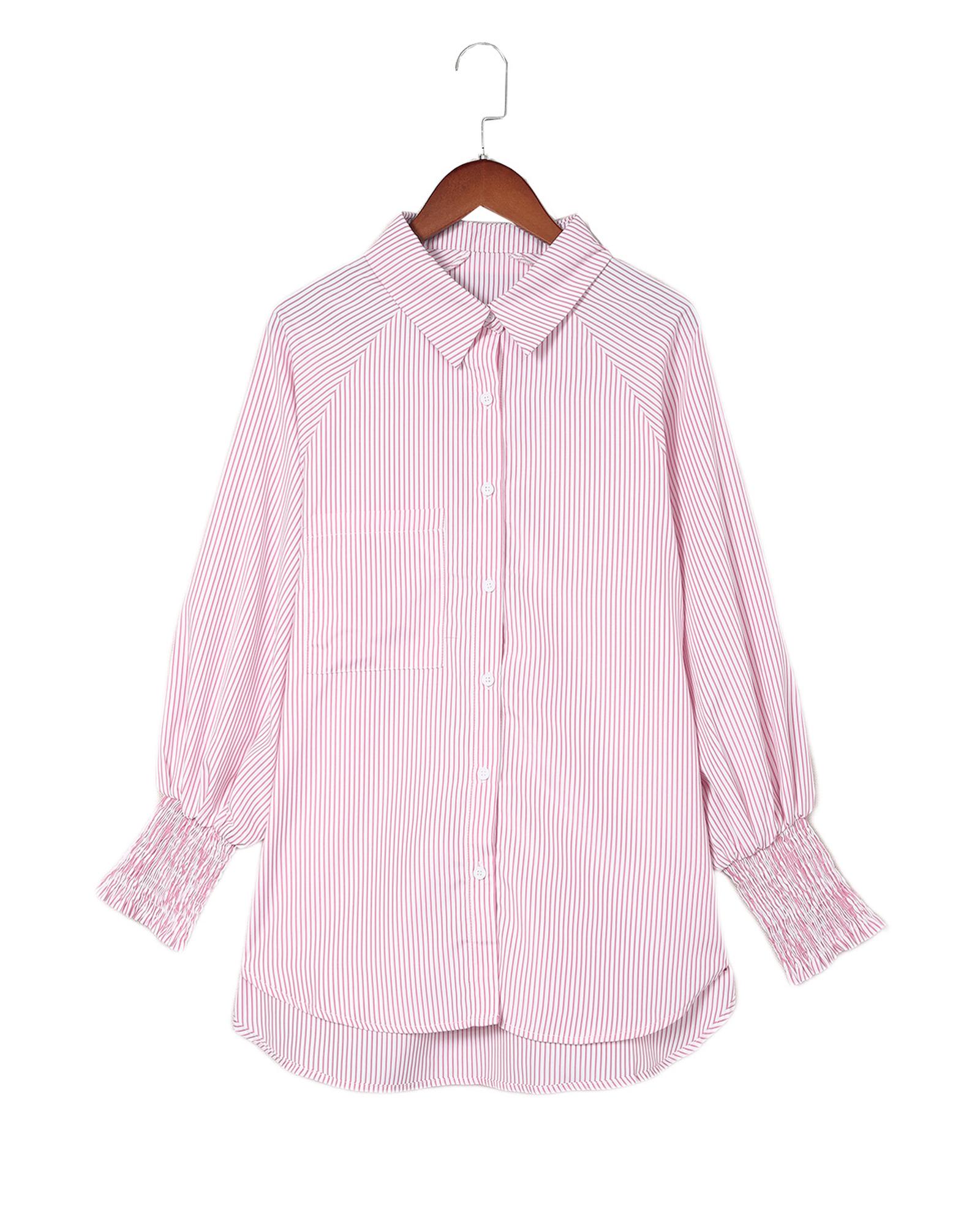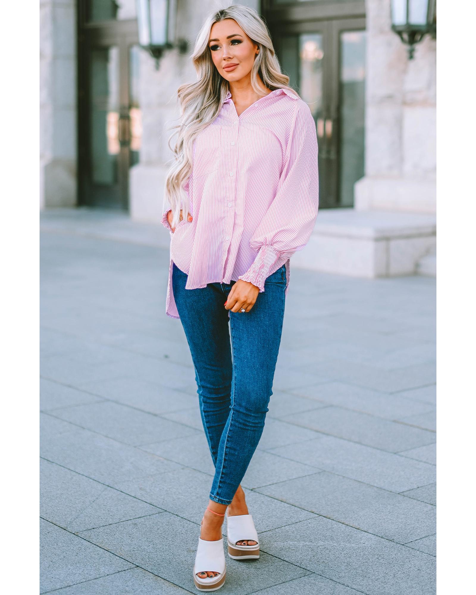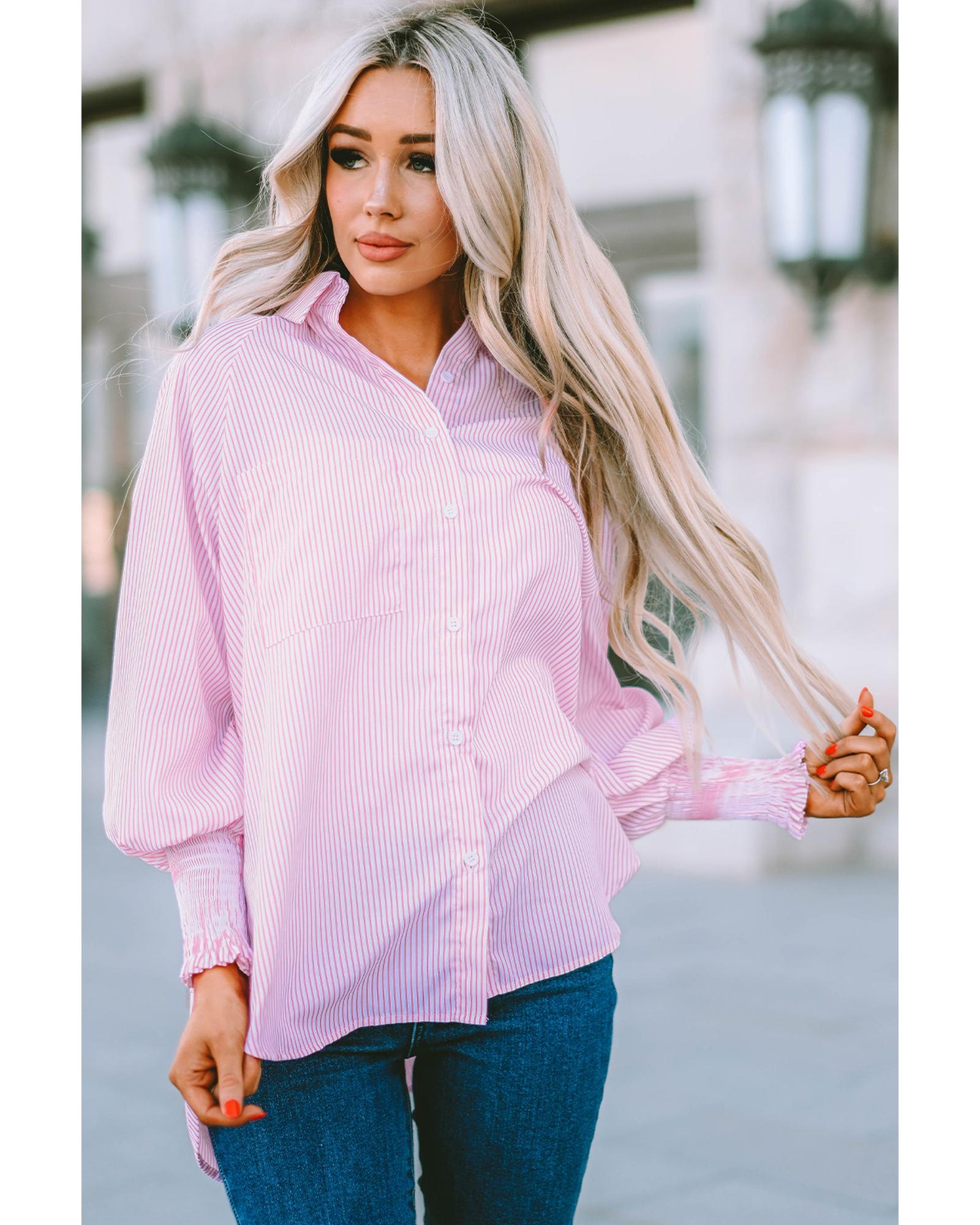 This striped boyfriend shirt features a versatile and stylish design suitable for various occasions. It combines classic patterning with modern details to create a fashionable look that can be dressed up or down. The shirt includes practical elements such as a pocket for small essentials and smocked cuffs that add a trendy touch.