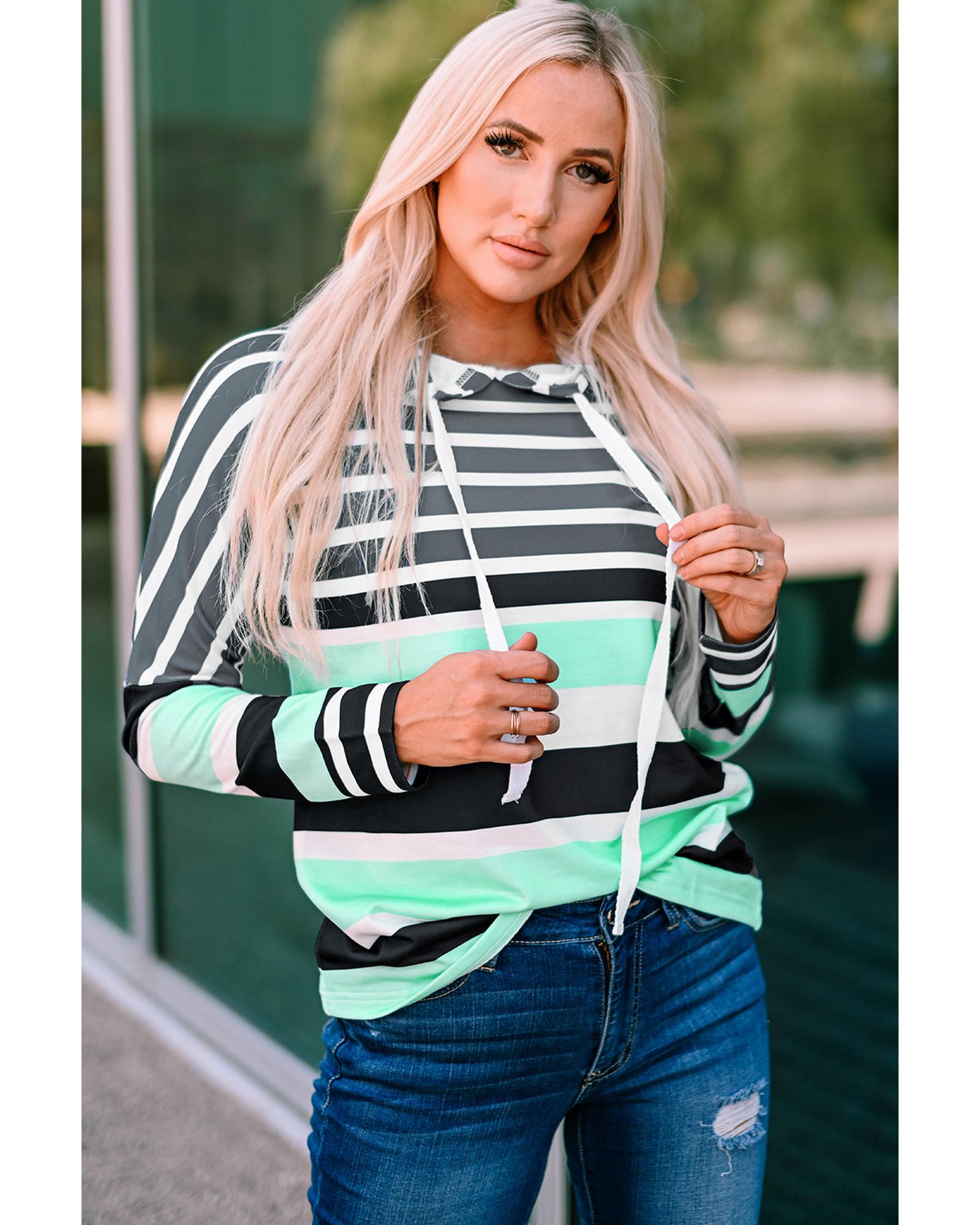 This striped drawstring long sleeve hoodie is designed for women, offering a comfortable and stylish option for casual wear. Made from a blend of polyester and elastane, it provides a soft feel and good stretch for ease of movement.