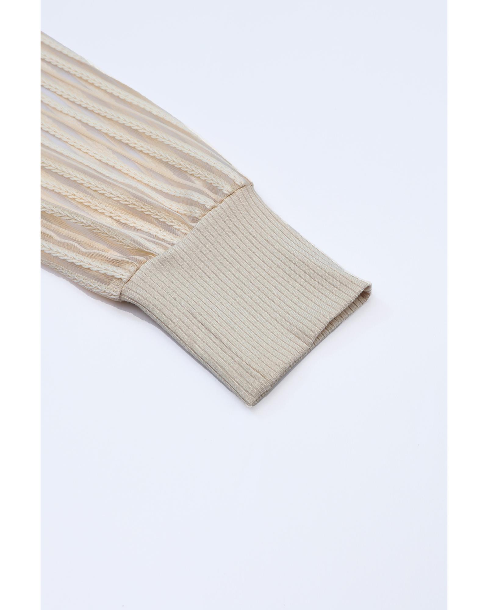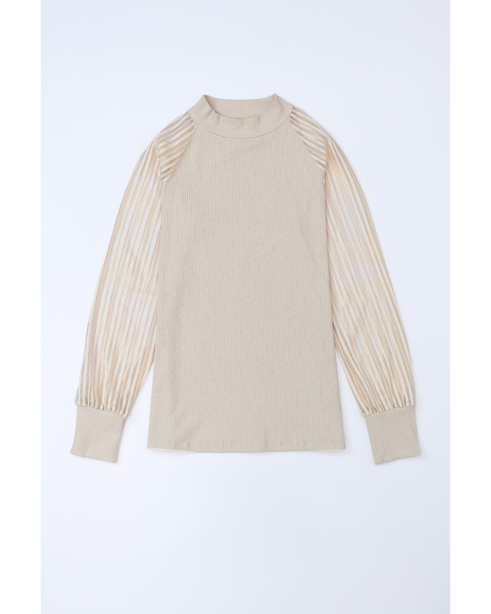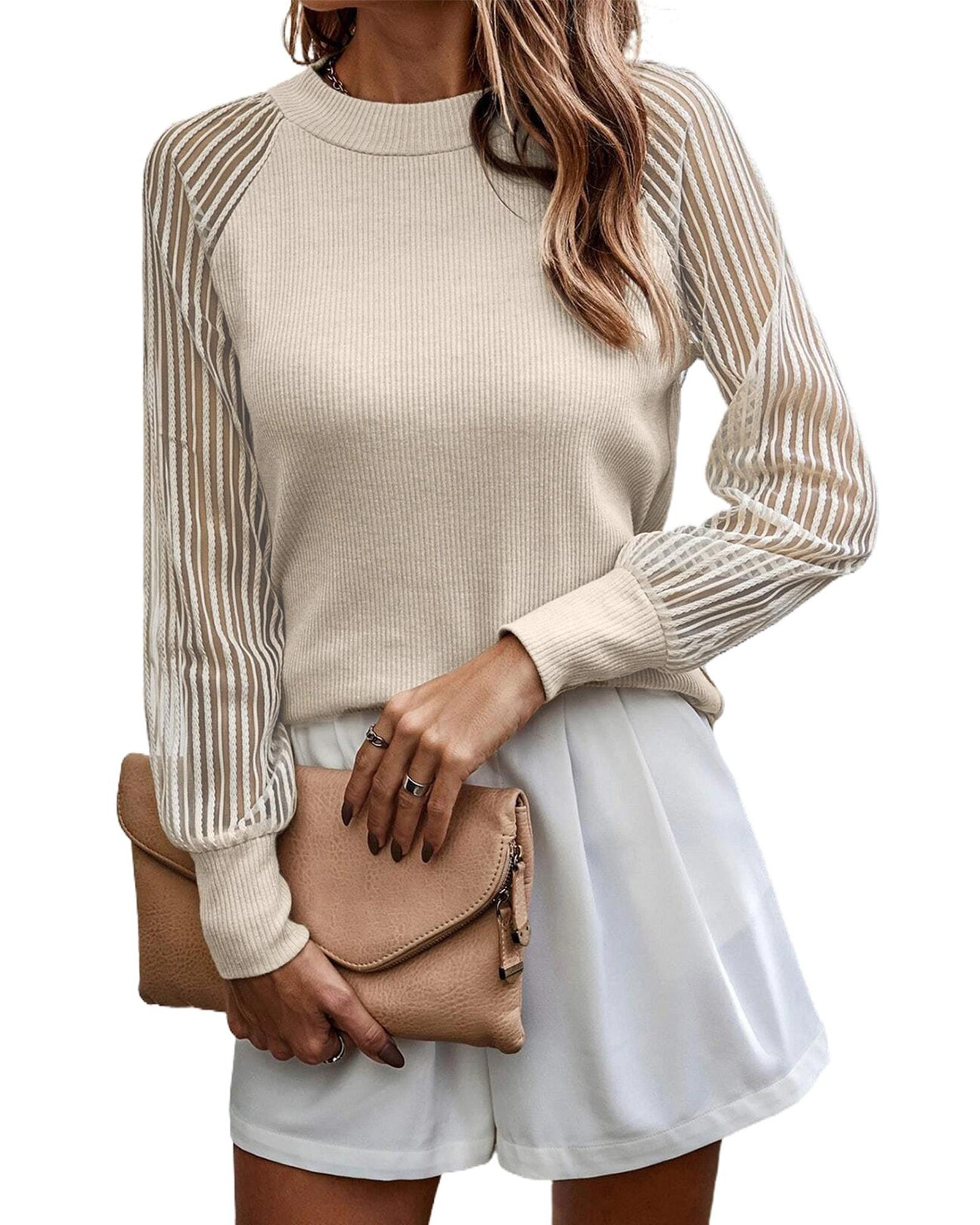 This long sleeve ribbed top features a stylish striped mesh design, offering a versatile addition to any wardrobe. Crafted with quality materials, it provides comfort and durability, making it suitable for various occasions. The classic crewneck with ribbed detailing adds a touch of sophistication and texture, enhancing your outfit with visual interest. Its apricot striped pattern makes it an eye-catching piece that can be dressed up or down and easily paired with jeans, skirts, or trousers. Designed for women, it is flattering for a variety of body types.