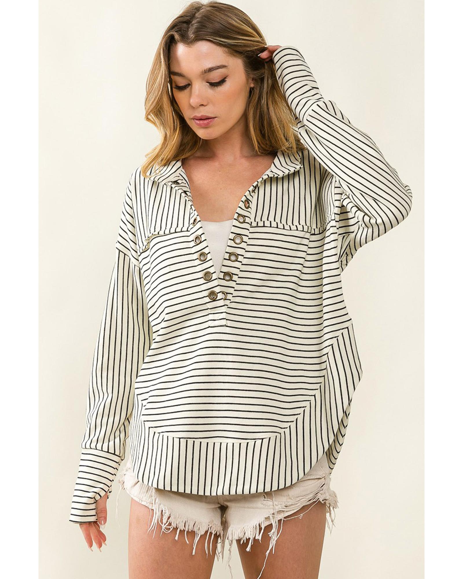 This casual blouse combines comfort and style with its unique design and high-quality materials. It features a trendy striped pattern and thoughtful details that enhance its overall appeal, making it suitable for everyday wear.