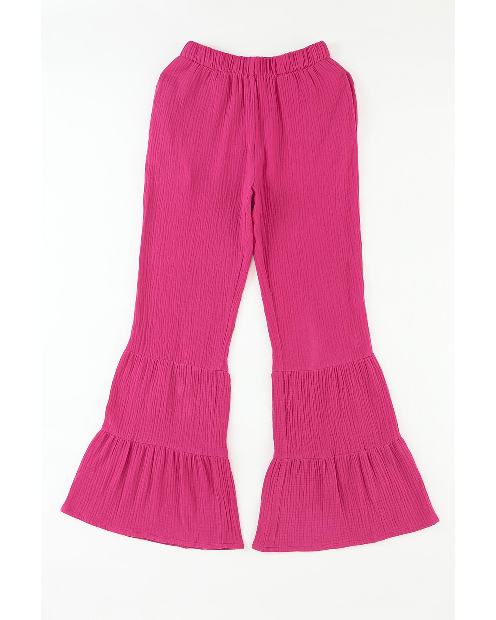 These textured high waist ruffled bell bottom pants combine stylish design with comfort and durability. Perfect for both casual and formal occasions, they can be dressed up or down to suit any look.