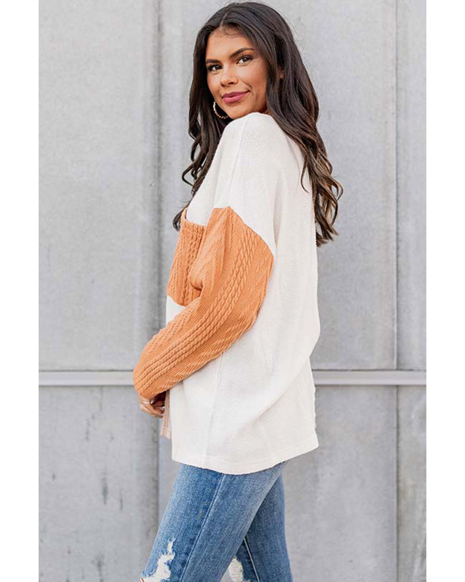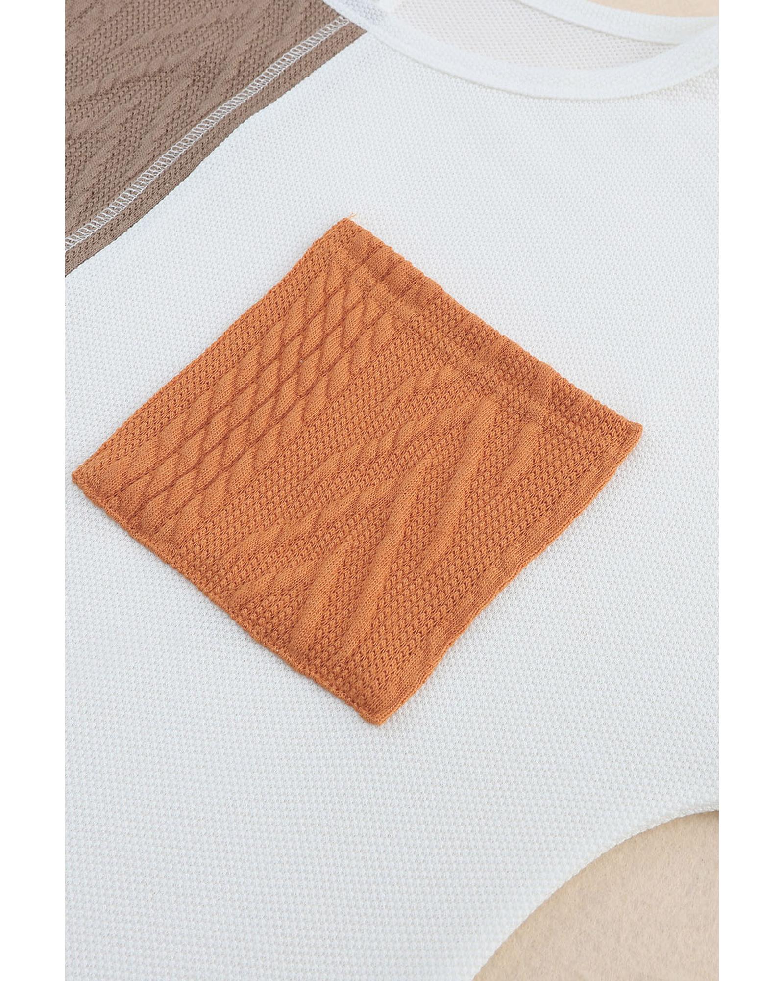 This textured knit top features a stylish colorblock design and a convenient chest pocket, making it a versatile addition to any wardrobe. Its long sleeves provide added coverage, while the textured fabric offers a sophisticated look suitable for various occasions.