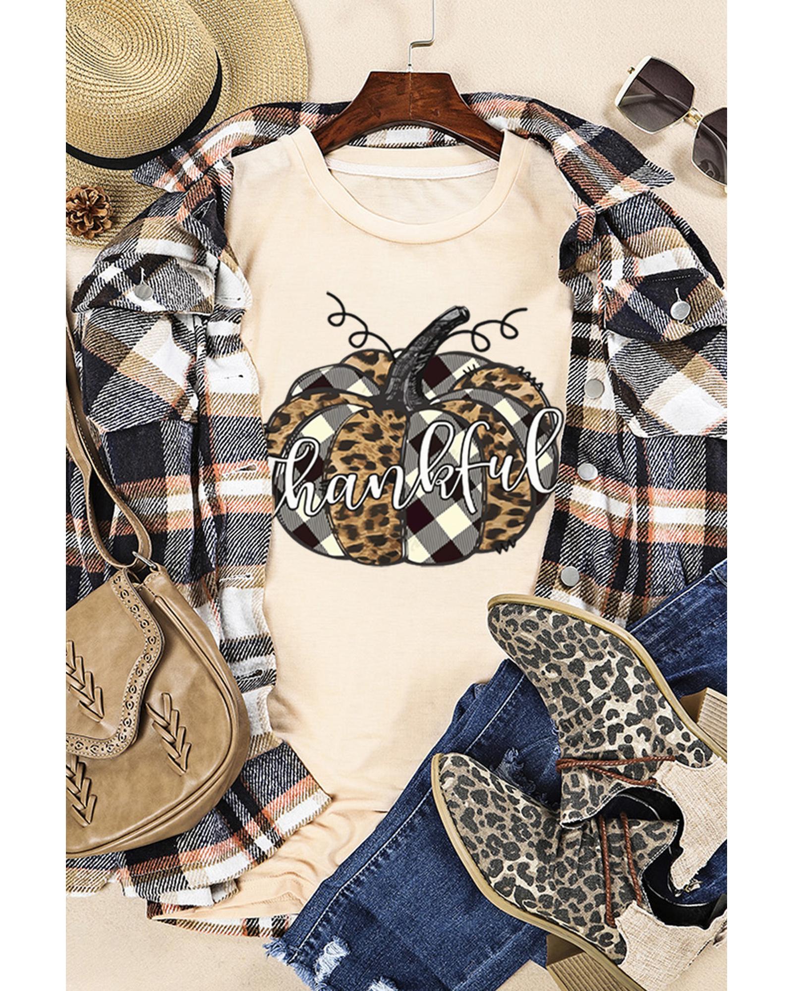 This graphic tee features a festive pumpkin plaid print combined with a thankful message, making it a stylish and comfortable choice for everyday wear. Its versatile design allows it to be paired easily with jeans or skirts, suitable for various casual occasions.