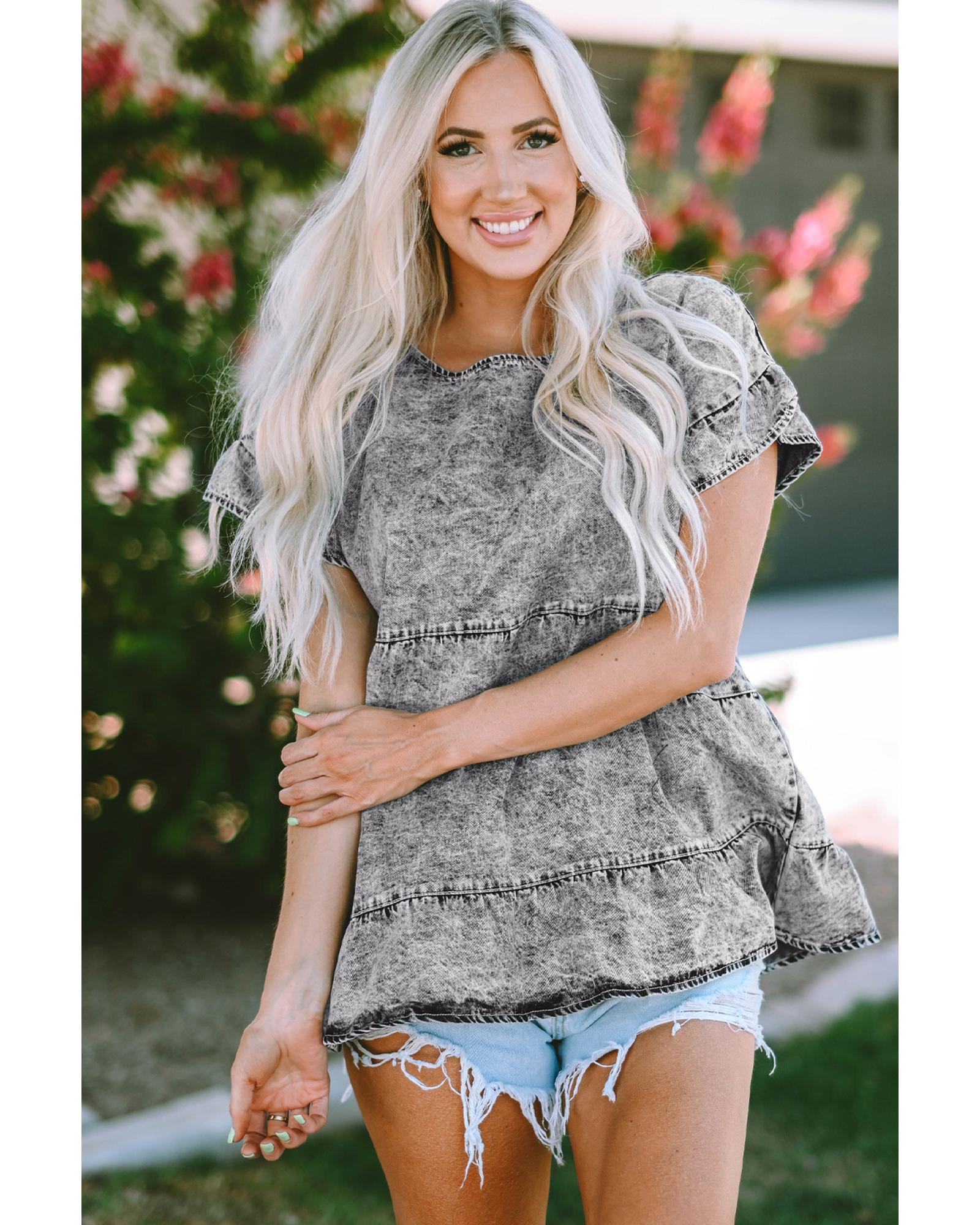 This tiered denim top features a stylish and feminine design with flutter sleeves, offering a versatile and fashionable addition to your wardrobe. Crafted from quality denim fabric, it provides a comfortable and flattering fit suitable for various occasions.