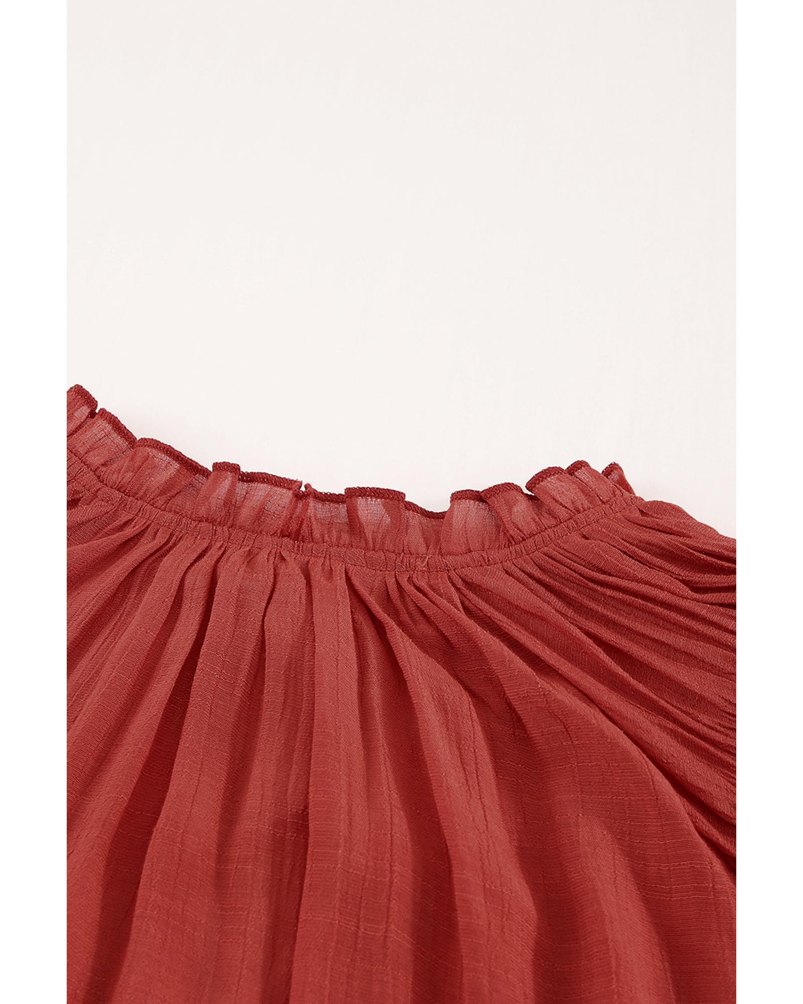 This tiered ruffled drawstring V-neck top offers a stylish and feminine look, making it a versatile addition to any wardrobe. Its playful ruffled detailing and flattering neckline enhance your overall appearance, while the adjustable drawstring at the waist allows for a customized fit. Crafted from quality materials, this top combines comfort and fashion effortlessly.