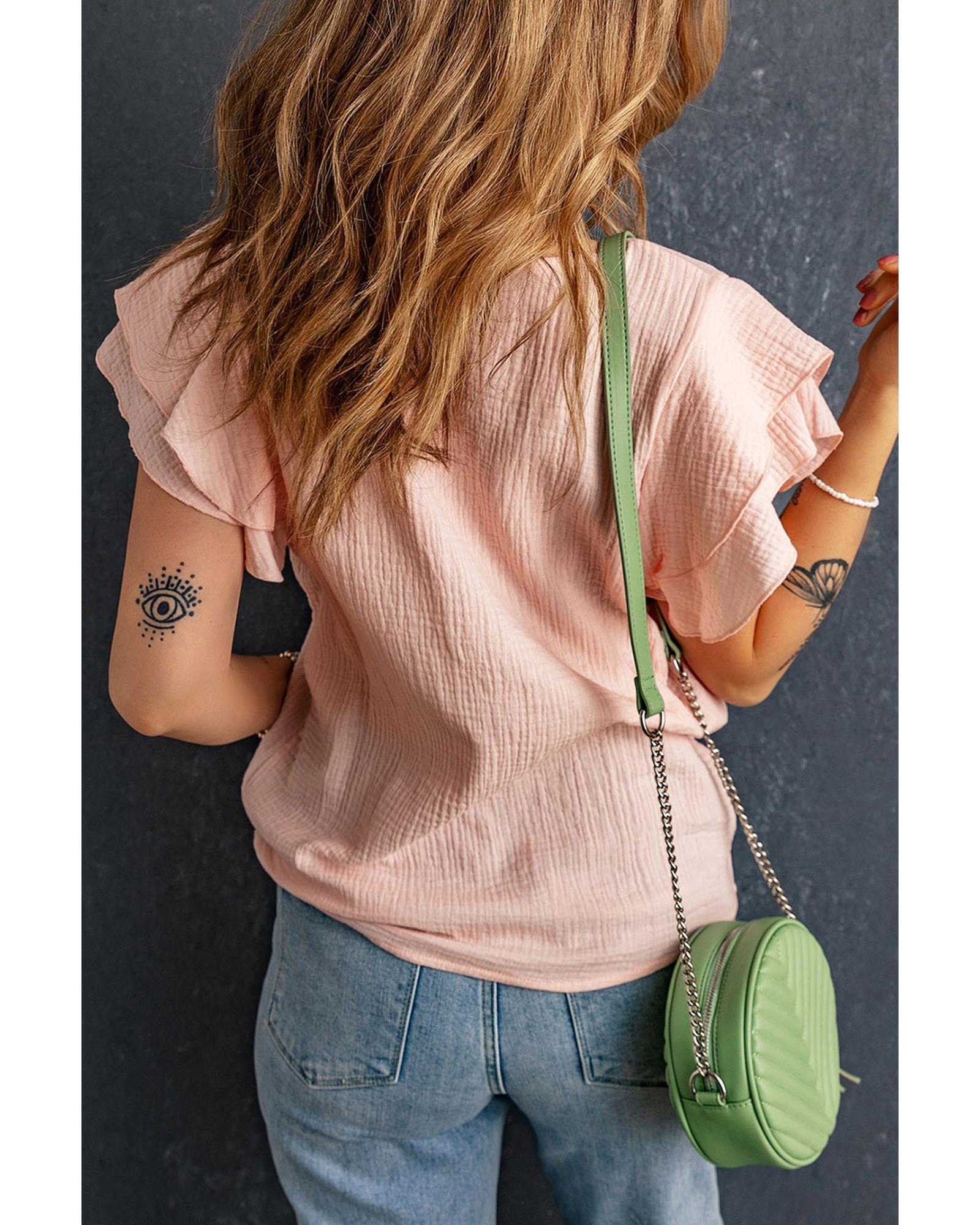 This textured tiered ruffled short sleeve blouse offers a stylish and versatile addition to your wardrobe. Designed with feminine details and made from quality materials, it combines comfort with elegance, suitable for both casual and formal occasions.