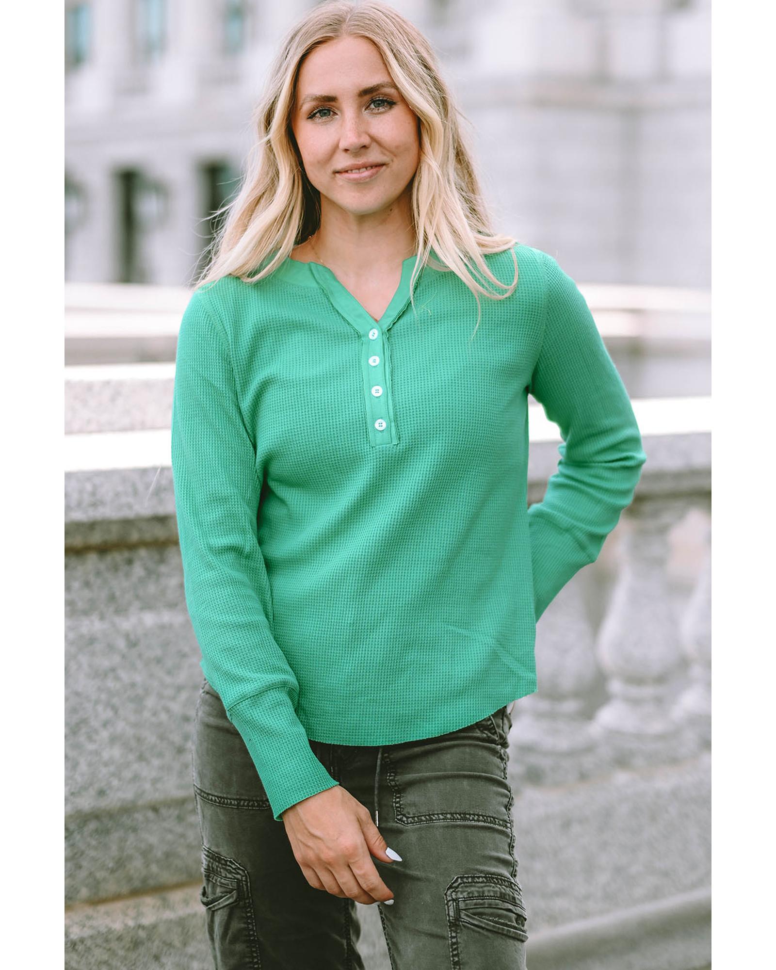 This waffle knit Henley top features a luxurious trimmed neckline, combining comfort with style. Crafted from high-quality materials, it offers a textured and dimensional look suitable for various occasions. Its versatile design allows for pairing with jeans, skirts, or trousers, making it a great addition to any wardrobe.