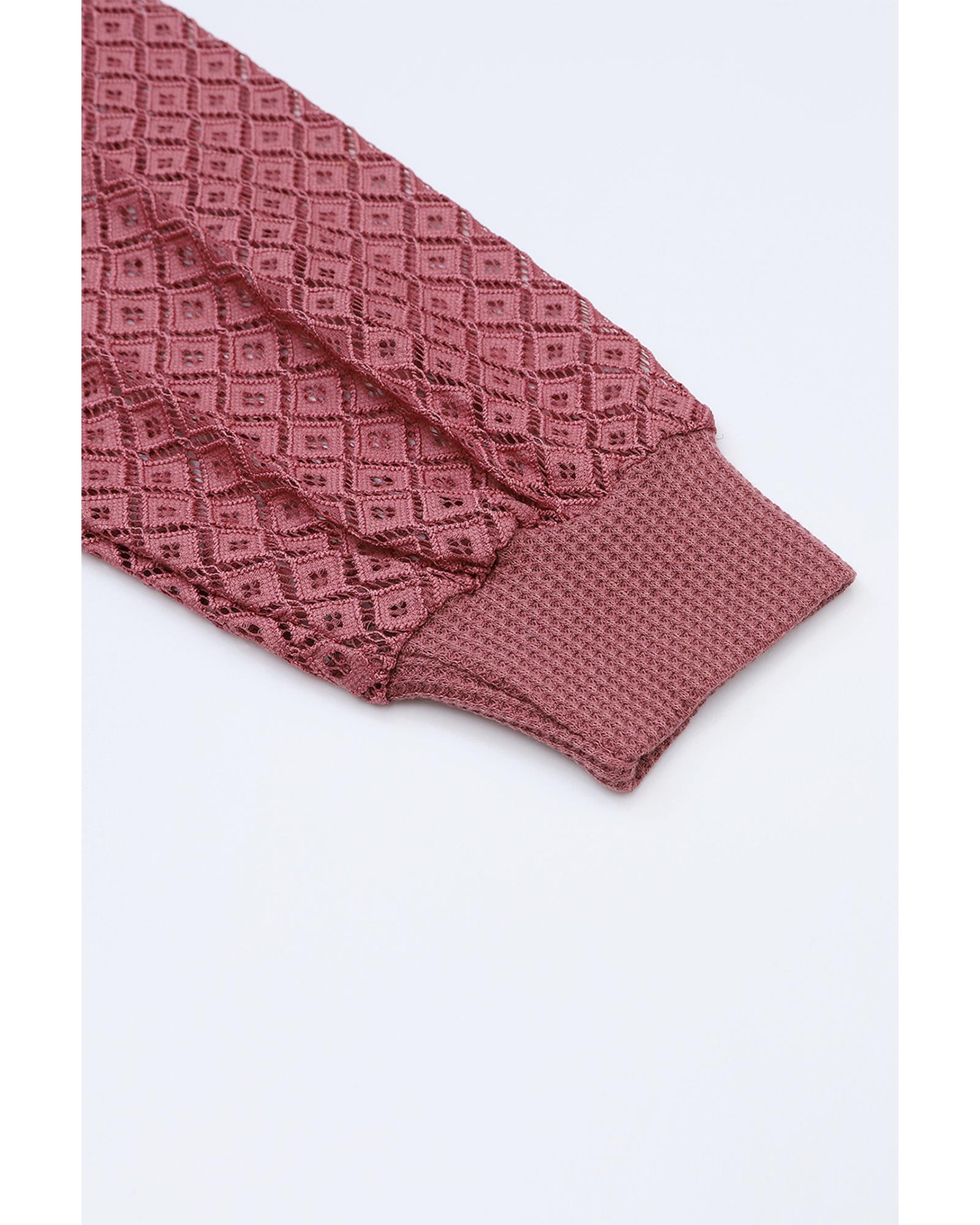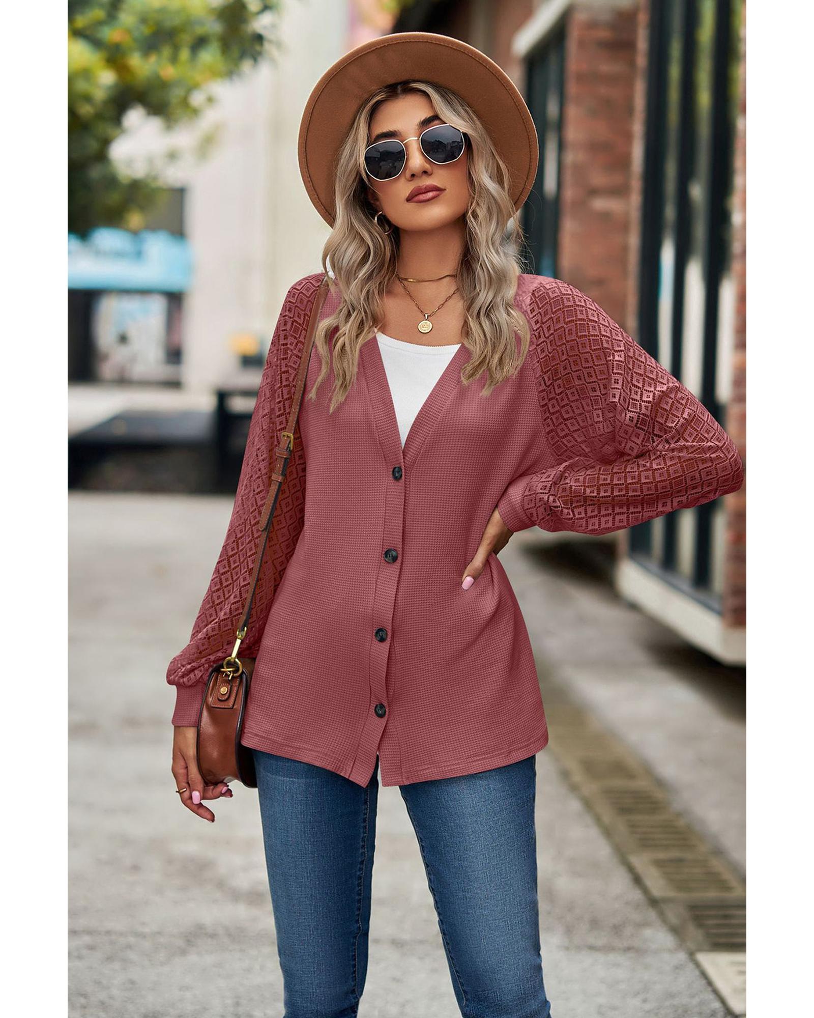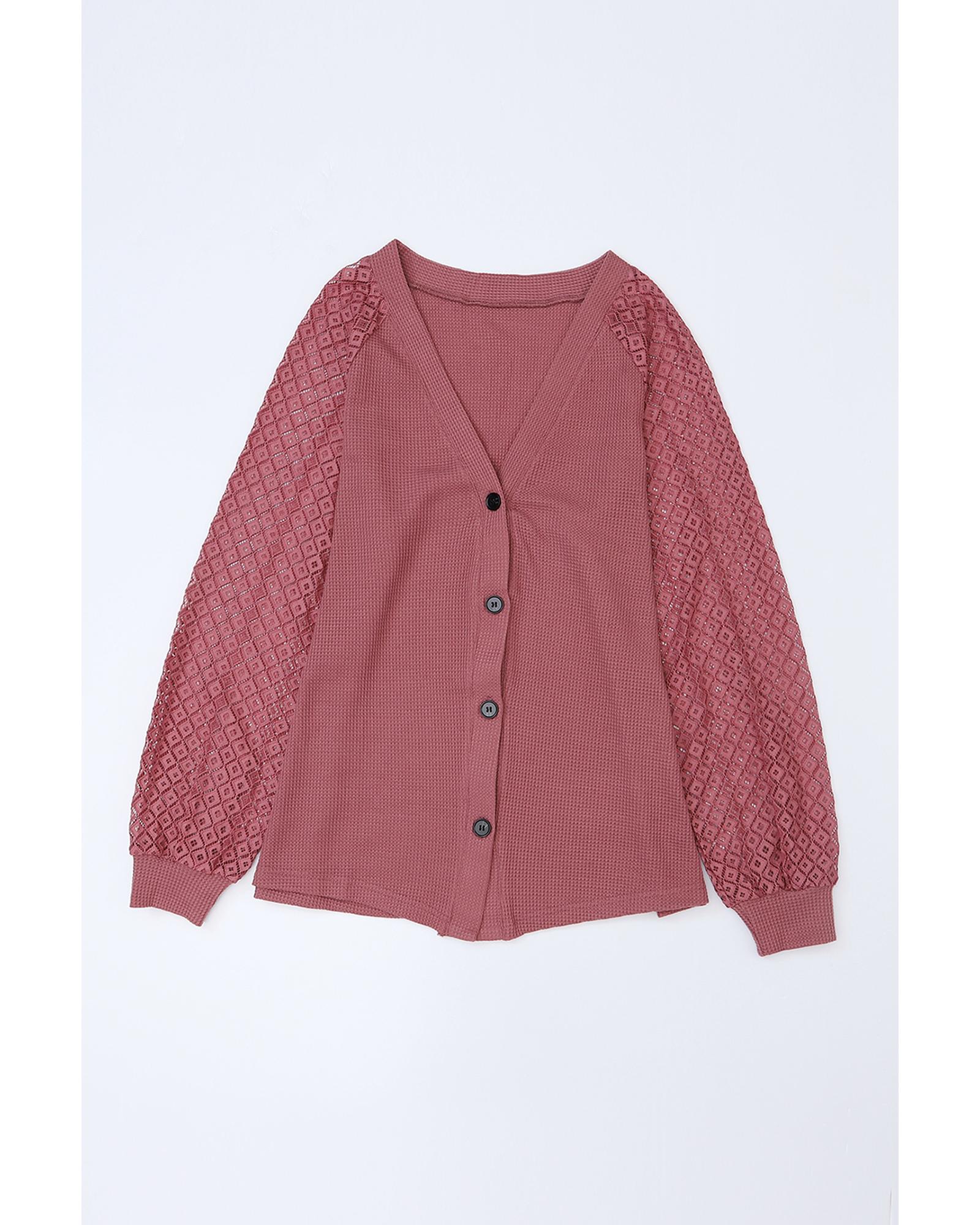 This long sleeve buttoned cardigan combines a cozy waffle knit texture with elegant lace patchwork, creating a stylish and comfortable piece suitable for various occasions. Its design features a front button closure and a V-neckline, offering effortless chic and versatility.